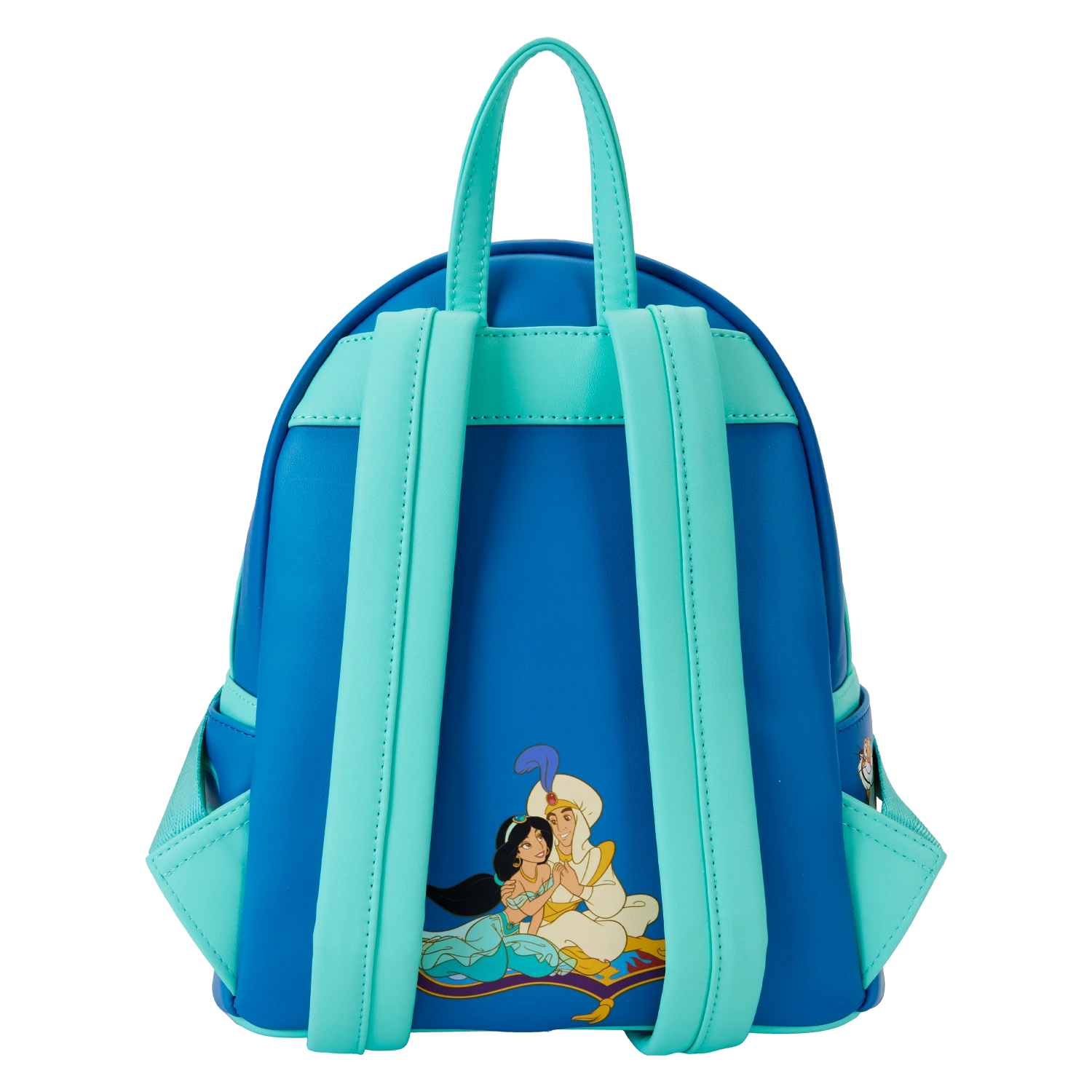 The Loungefly Princess Jasmine Lenticular Mini Backpack is made of vegan leather (polyurethane). Backpack has padded adjustable shoulder straps, side pockets, and gold-colored metal hardware. Additional features include applique, printed, lenticular, and debossed details. Take note of the coordinating inside lining.