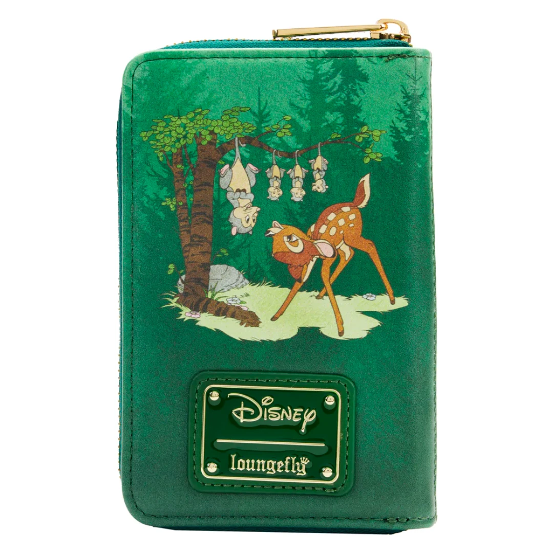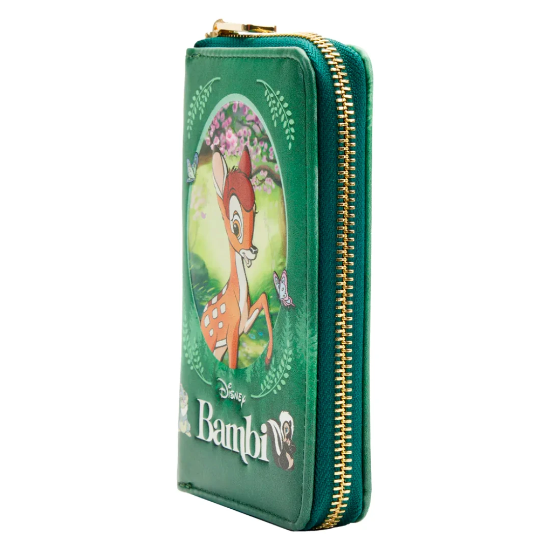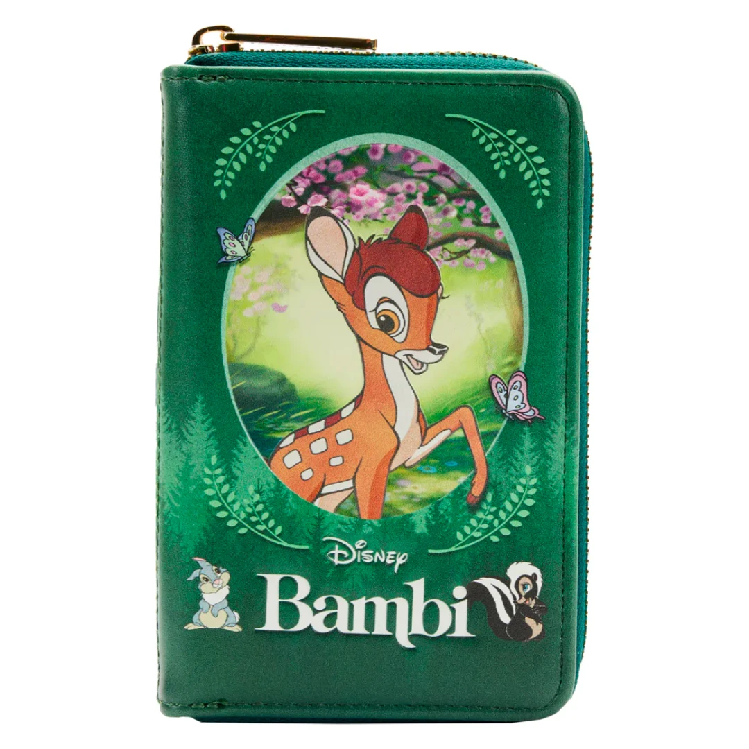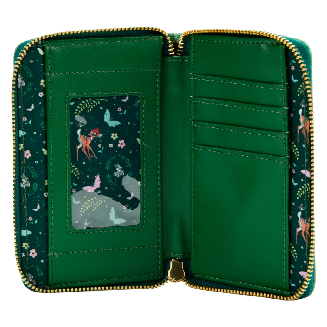Bring the lessons of the forest to life with this Bambi Classics Books Zip Around Wallet. Bambi’s adorable face, surrounded in lush detail, by flowering trees and a butterfly peeks through a forest green background. On the back, Bambi makes another appearance beneath delightful opossums that hang upside down in a tree. Printed details, on a rich, forest green background, make the story come to life. Inside, there are 4 slots for holding cards, 1 clear slot for holding your ID, and billfold slots on either side. It’s the perfect accessory to any outfit or for turning everyday outings into magical adventures.