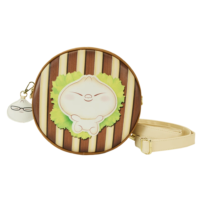 The Bao Bamboo Steamer Crossbody Bag is made of vegan leather (polyurethane). Bag has adjustable (detachable) shoulder strap, detachable bag charm, and shiny gold hardware. Additional features include applique, debossed, and printed details. Take note of the coordinating inside lining.