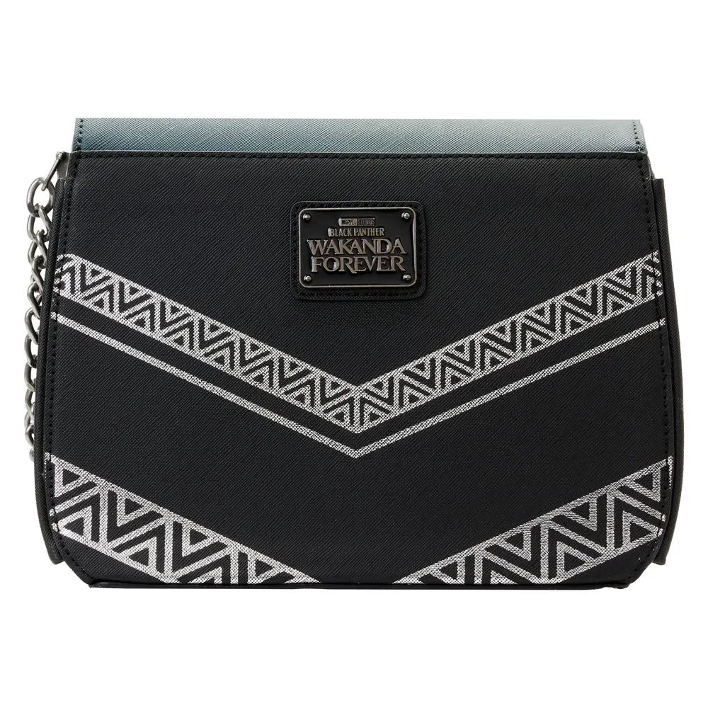 The Loungefly Black Panther: Wakanda Forever Crossbody Bag is made of vegan leather (polyurethane). Bag has adjustable chain shoulder strap (detachable) and sturdy metal hardware. Additional features include debossed and printed details. Take note of the coordinating inside lining.