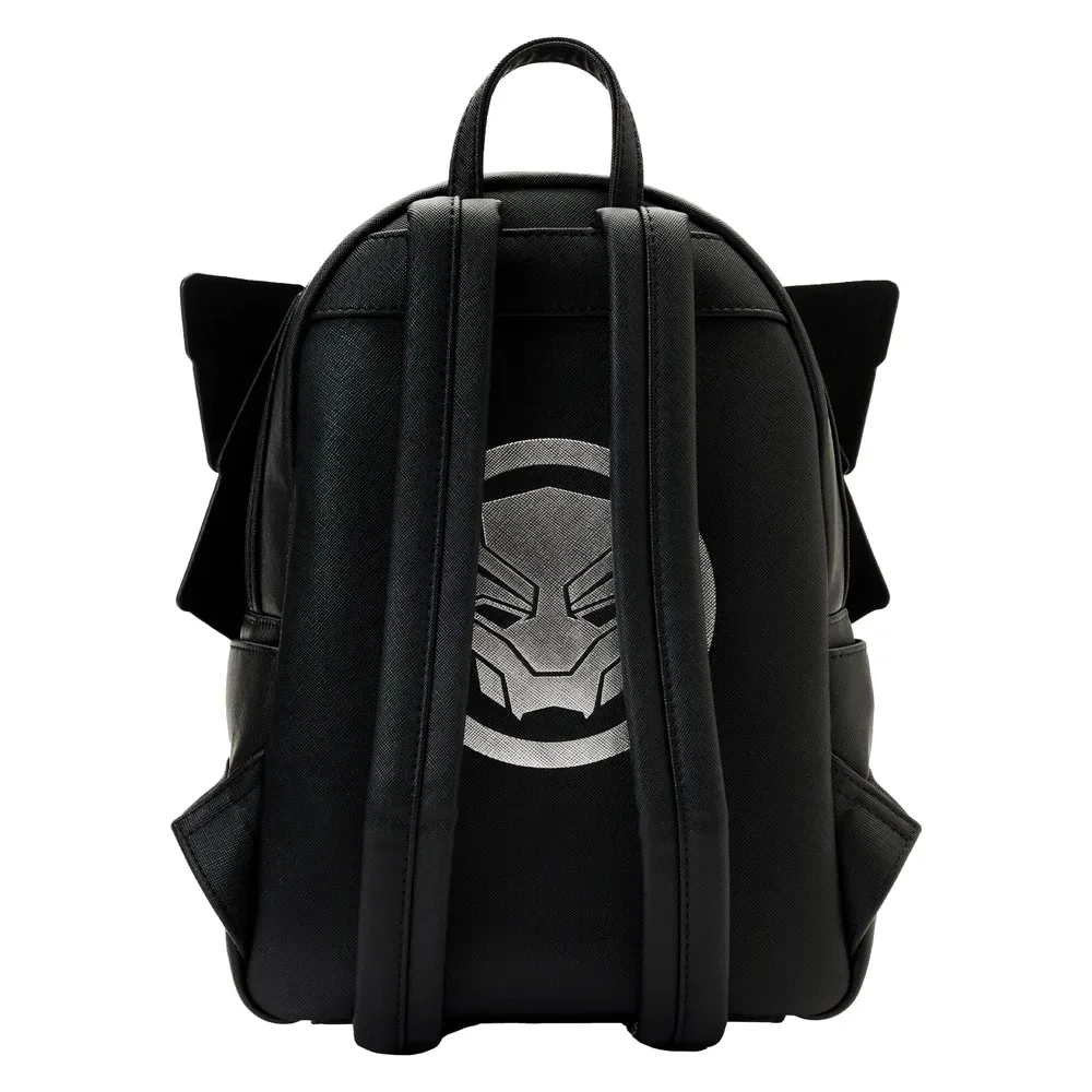 The Loungefly Black Panther: Wakanda Forever Figural Mini Backpack is made of vegan leather (polyurethane). Backpack has adjustable shoulder straps and sturdy metal hardware. Additional features include applique, debossed, and printed details. Take note of the coordinating inside lining.