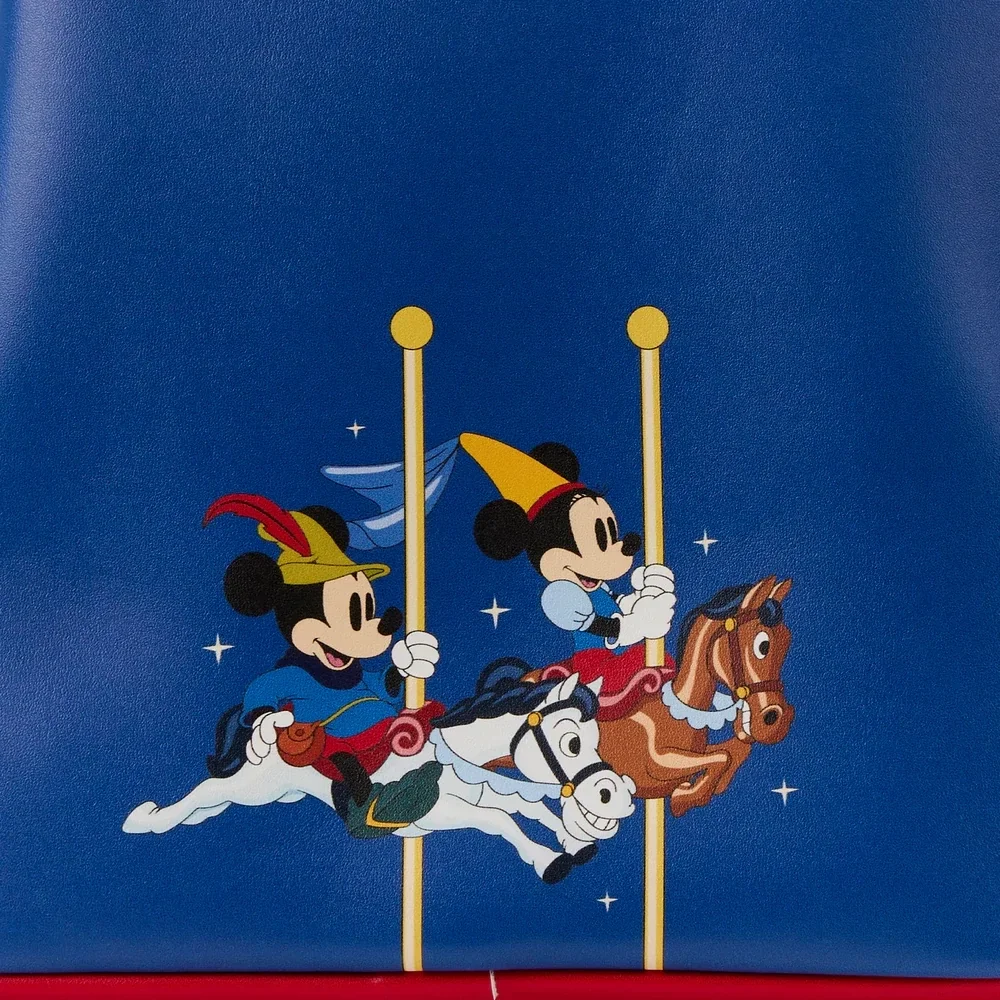 Royal adventures are tailor-made with our Loungefly Brave Little Tailor Minnie Mouse Cosplay Mini Backpack. Princess Minnie Mouse eagerly awaits news about the Brave Little Tailor defeating the giant. Her adorable face, brought to life in applique detail, peeks up over the front zipped pocket, and a zipper charm of the king adds to the story. Minnie’s princess hat and applique tulle veil rise up over the top of the backpack. Her princess outfit weaves itself over onto the side pockets as well. Picking up the thread of the story on the back, you’ll find Mickey Mouse and Minnie Mouse celebrating at the town carnival, riding horses on the carousel. Enjoy “sew” many fun-filled adventures—or simply turn everyday outings into character-filled memories.