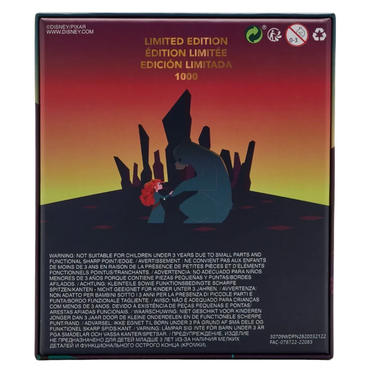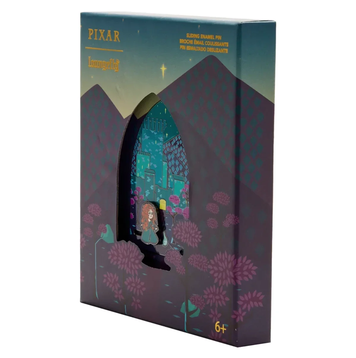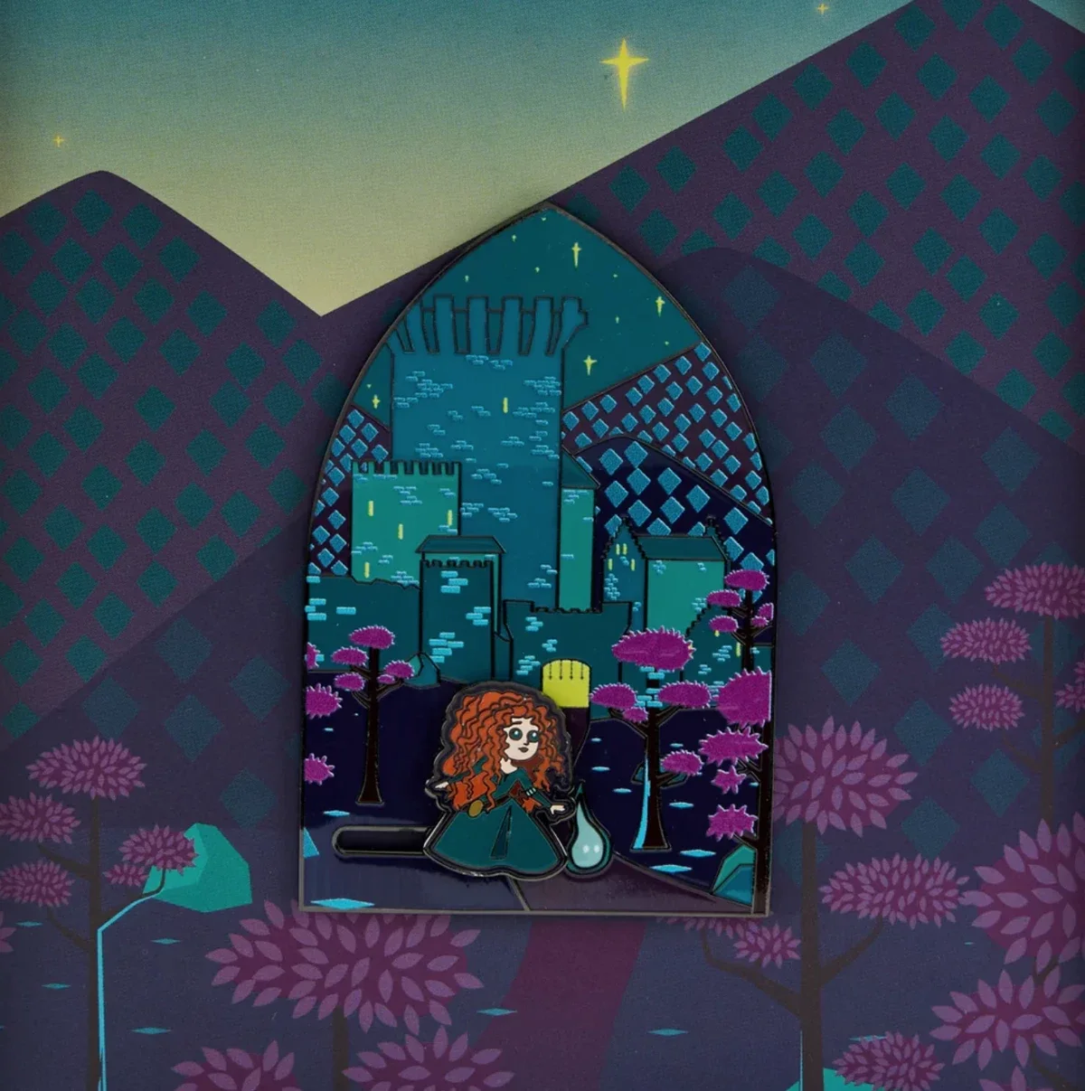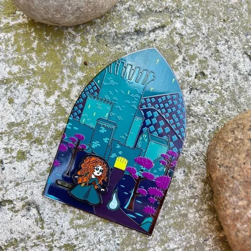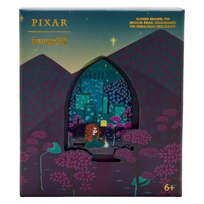 Commemorate an iconic moment with the Brave Merida Castle Sliding Pin. As Merida questions whether she can change her fate, she encounters a mysterious will-o’-the-whisp in the forest outside her kingdom. Merida slides closer to follow the woodland spirit in search of her destiny, bringing this scene from Brave to life like a true Scottish fairy tale. Notice the decorated detail of the Scottish Highlands behind the castle walls. This 3-inch pin adds a majestic and adventurous element to any outfit, and is a perfect accessory for fans who are looking to keep one of their favorite animated movies close.