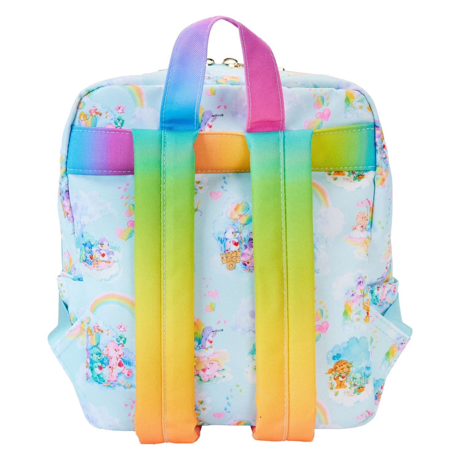 The Loungefly Care Bears Cousins All-Over Print Small Square Nylon Mini Backpack is made of nylon. Backpack has adjustable padded shoulder straps, side pockets, and gold-colored metal hardware. Additional features include printed details. Take note of the inside lining featuring the Loungefly logo.