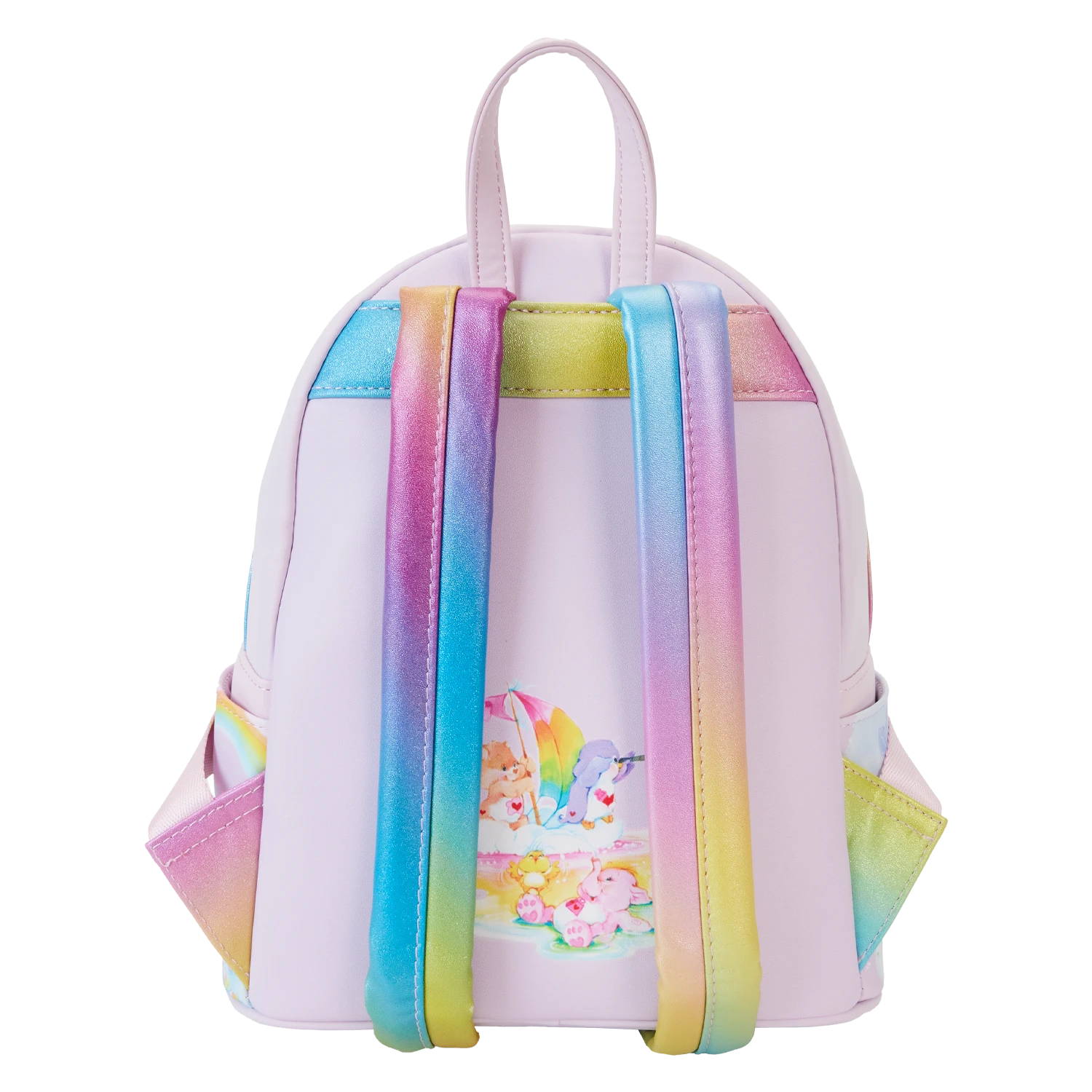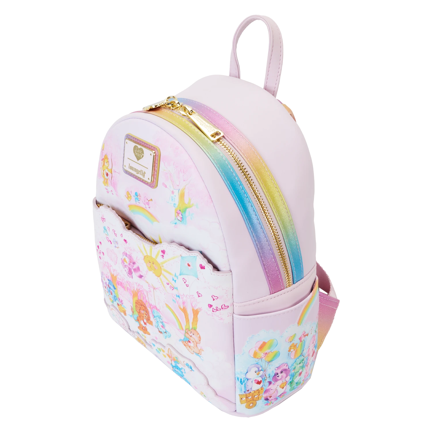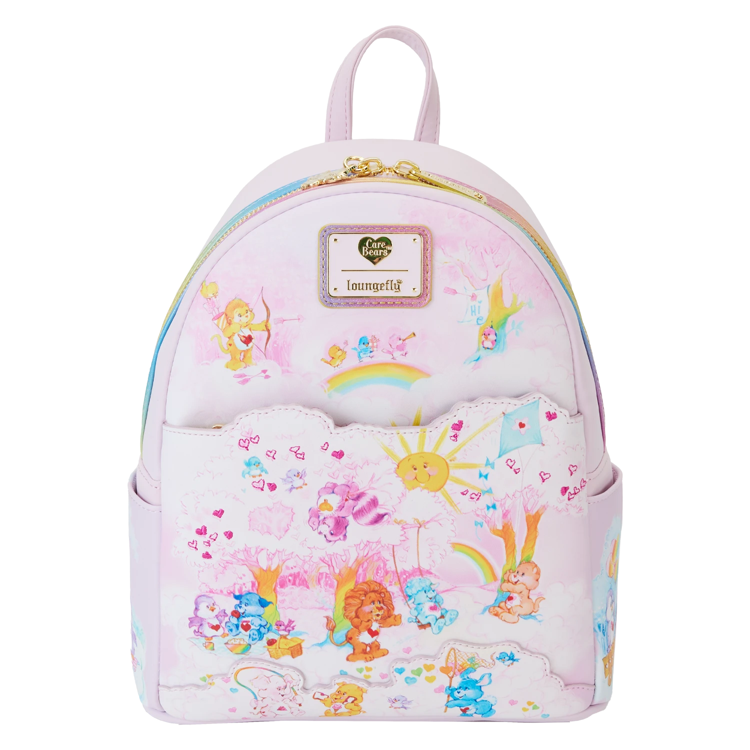 Journeying to Care-a-Lot? Take along our Loungefly Care Bears Cousins Cloud Crew Mini Backpack. On the front of this charming pink accessory, you’ll find an applique layer of clouds filled with Care Bears and Cousins characters. The cloud scene, with a scalloped applique die-cut edge, features prints of a bright sun, trees with hearts, birds, and a kite. You might be able to spot Brave Heart Lion and Bright Heart Raccoon, along with more Care Bears and Cousins jumping rope, enjoying a picnic, and catching hearts in a net. Just behind this cloud layer is a hidden pocket for storing smaller items on your journeys. The scene above features Playful Heart Monkey with a bow and arrow, a rainbow, cheerful birds, more clouds, and a rainbow tree. Follow the delightful artwork to a side pocket to discover lovable characters, clouds, and rainbows with heart-shaped balloons. The other side pocket displays printed artwork of Cozy Heart Penguin and Loyal Heart Dog on a cloud, under a blue and white tree, sharing a delicious snack. Iridescent rainbow straps add more shine and color. Turn the backpack around, and you’ll find Lotsa Heart Elephant, Cozy Heart Penguin, and other characters setting sail on a cloud with a rainbow mast. Share a message of caring wherever you go with this delightful accessory.