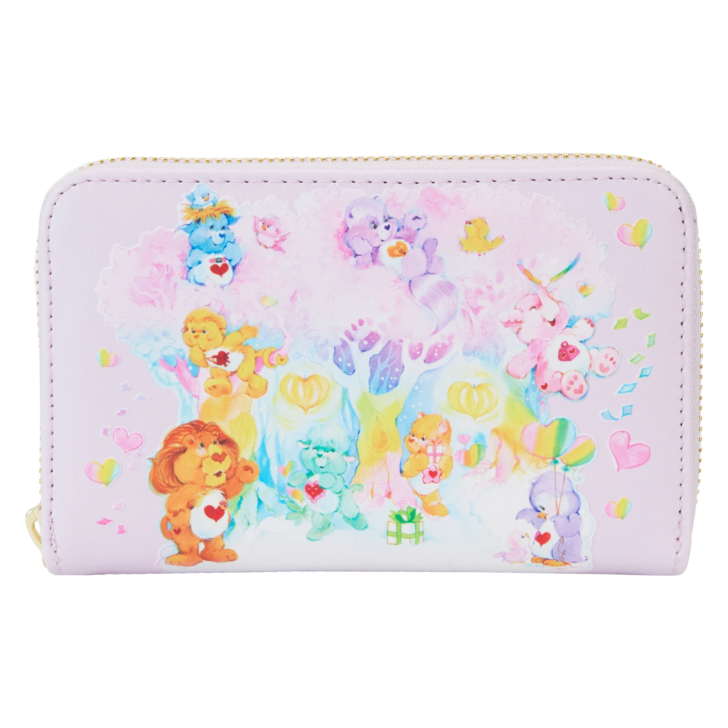 Journeying to Care-a-Lot? Stop by the Forest of Feelings in style with our Loungefly Care Bears Cousins Forest Fun Zip-Around Wallet. On the front of this soft pink wallet, you’ll find dreamy artwork of a forest scene. Rainbow trunks lead to frosty pink leaves. Among them, favorite Care Bears and Cousins play. You might be able to spot Brave Heart Lion, Lotsa Heart Elephant, Cozy Heart Penguin, and more—along with cheerful birds and colorful hearts. On the back, Playful Heart Monkey paints while Loyal Heart Dog sends a message in a bottle on the water. A rainbow, birds, and a pink tree complete the scene. Inside, you’ll find approximately four slots for holding cards and one clear slot for displaying your ID. A die-cut shape of a heart, on the clear slot, adds a signature touch. Share a message of caring wherever you go with this delightful accessory.