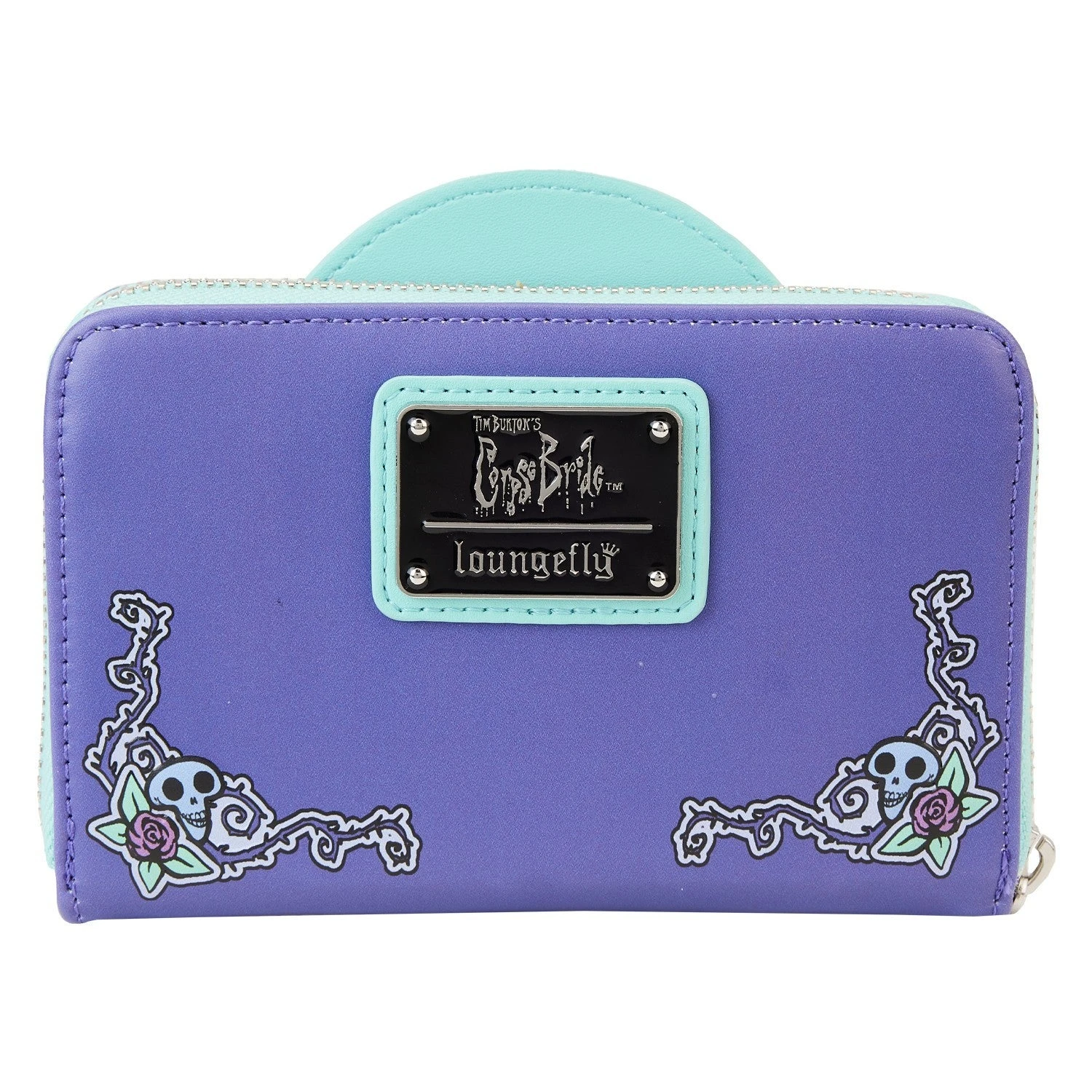 Follow the moonlight to the Land of the Living in style. Say, “I do” to our Loungefly Warner Bros. Corpse Bride Moon Zip-Around Wallet. A full moon rises up behind Emily, who carries Victor through the night. A printed applique of skulls and flowers frames them, and butterflies dart in the light behind them. Lenticular features reveal an alternate view: Emily and Victor in shadow form against the moon. On the back, Scraps appears, along with decorative skulls and flowers. Inside, you’ll find 4 slots for holding cards and 1 clear slot for displaying your ID. Get carried away in spellbinding style with this hauntingly beautiful accessory.