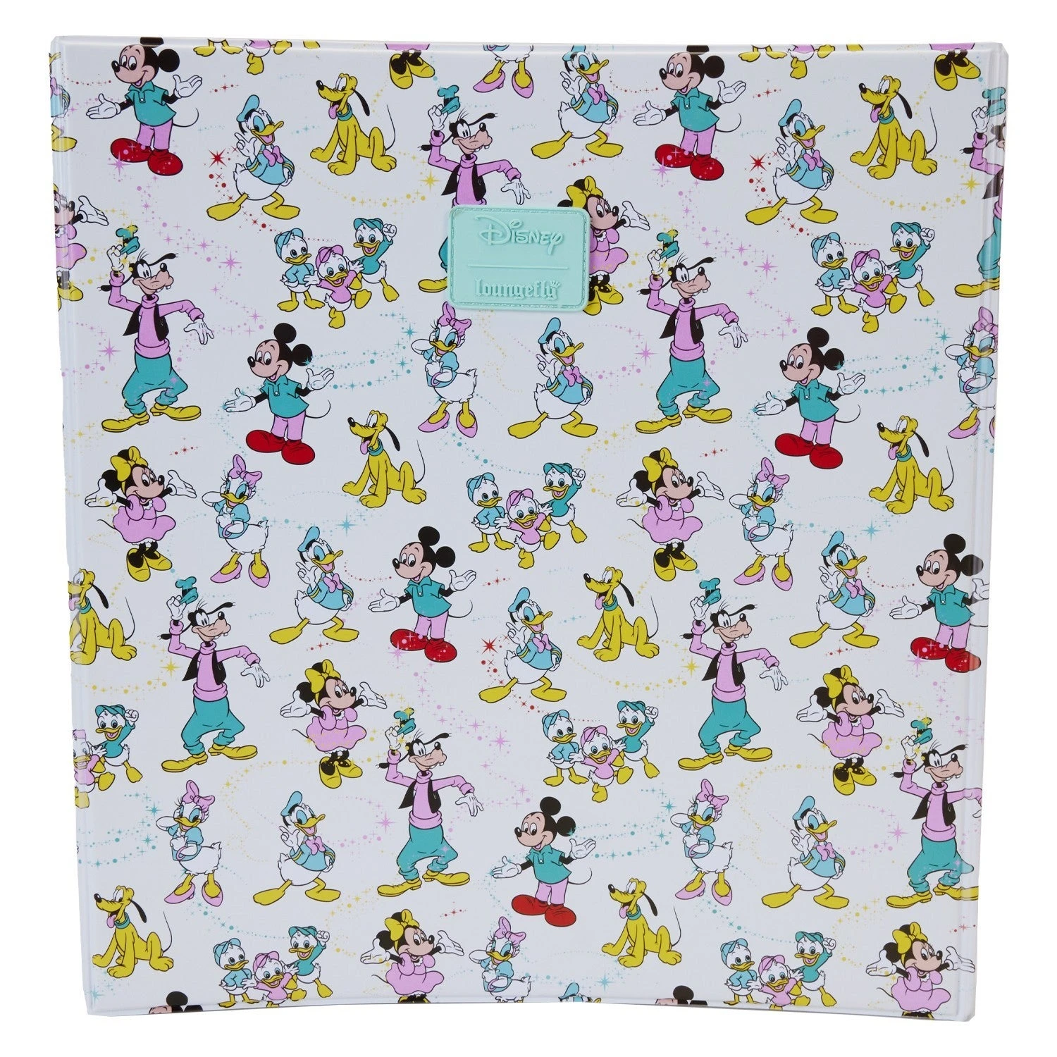 The D100 Mickey Mouse and Friends Binder is made of vegan leather. Features include three rings for securing paper and folders, a Velcro tab closure, interior flap pockets, and printed details.