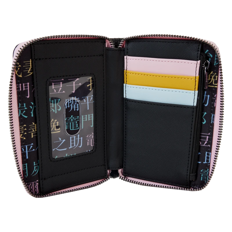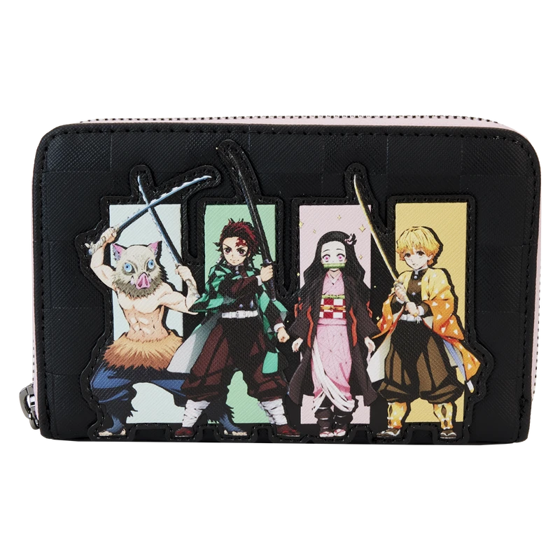 The Demon Slayer Group Zip-Around Wallet is made of vegan leather (polyurethane). Wallet zips closed with shiny gunmetal-colored hardware. Additional features include applique, debossed, and printed details. Take note of the coordinating inside lining.