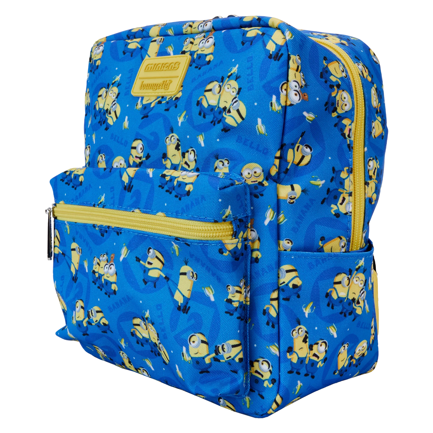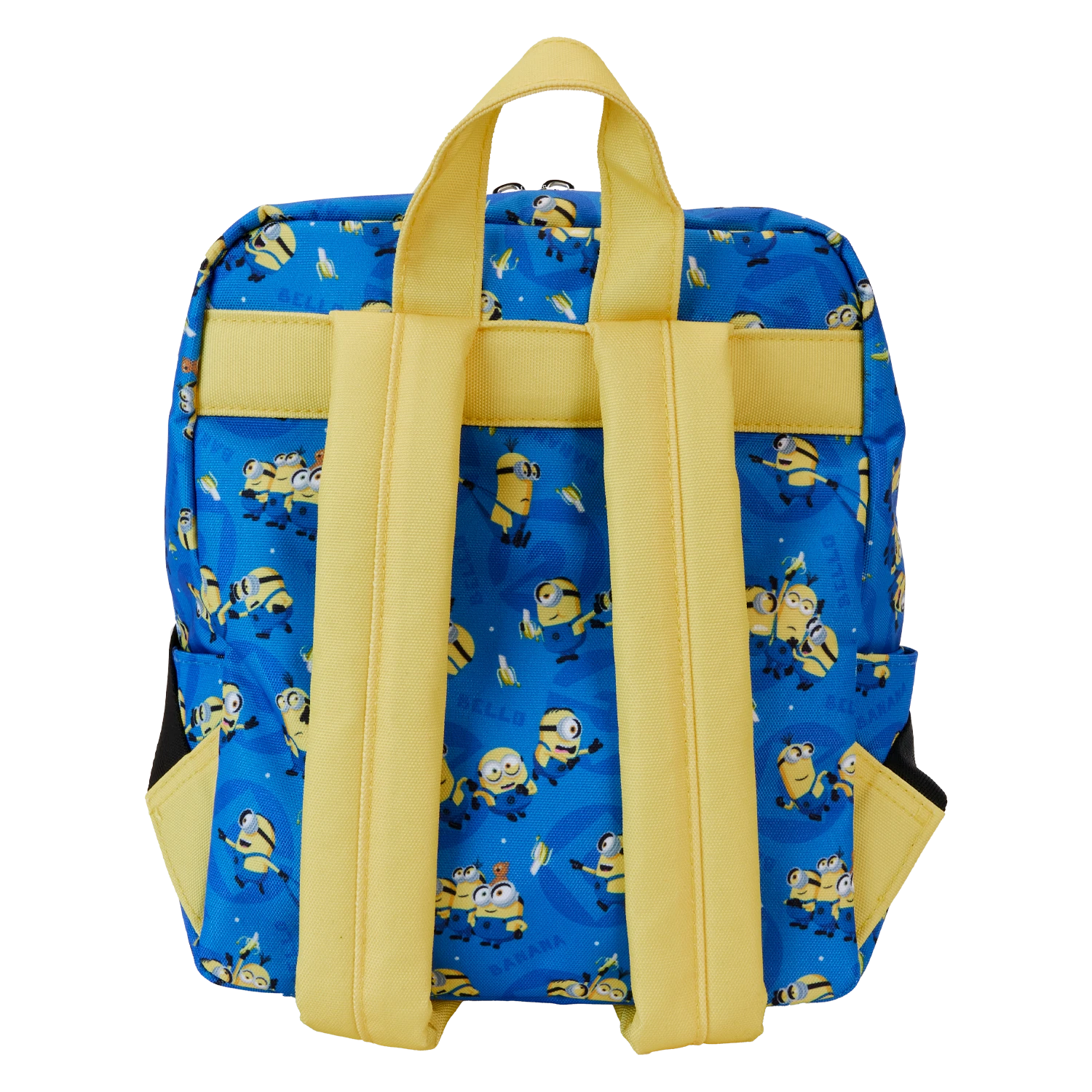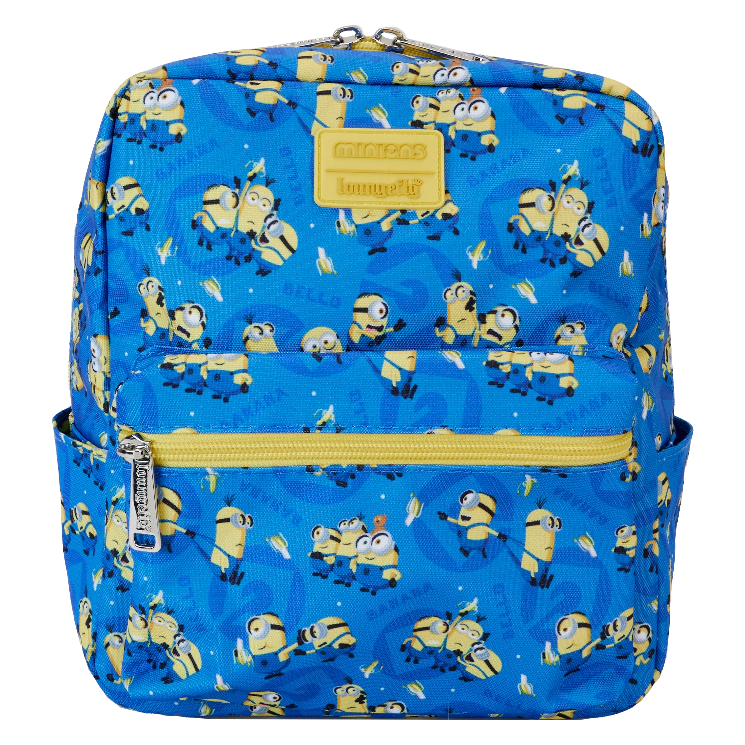 Banana! This Minions mini backpack is ready for adventures. Yellow trim and straps add a pop of color to contrast with the blue field, against which a print of the Minions unfolds. Behind the Minions, in a darker blue pattern, you might discover the “Gru” symbol and the word “Bello” as a motif. A front-zipped pocket is perfect for storing smaller items during your journeys. Pack just what you need for the day to cause some good-natured mischief in style.