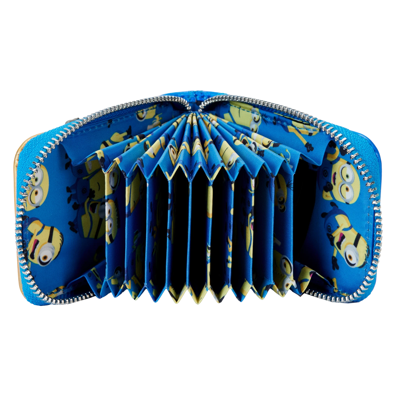 Ooh! Bello! Our Minions accordion wallet is ready for some fun. This accessory features a Minion on the front in shiny gold and blue iridescent detail. His big eyes are framed by silver goggles with clear PVC material over the front to create see-through “lenses.” Embroidered facial features bring this lovable character to life. On the back, you’ll find Gru’s symbol in printed, debossed form, blending into the iridescent blue background. Inside, there are plenty of slots for storing cards or your ID. Secure your valuables for the day and cause some good-natured mischief in style.