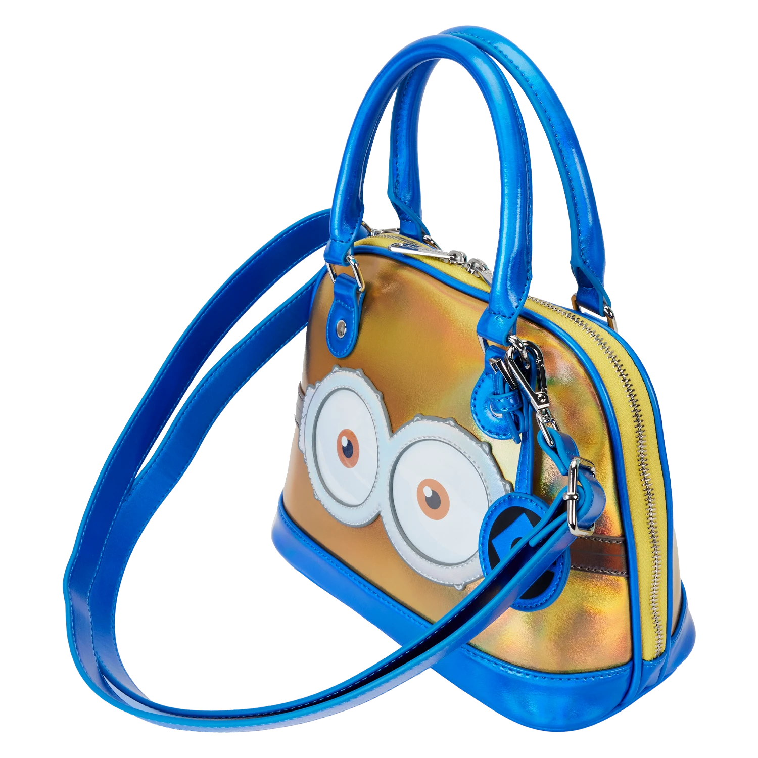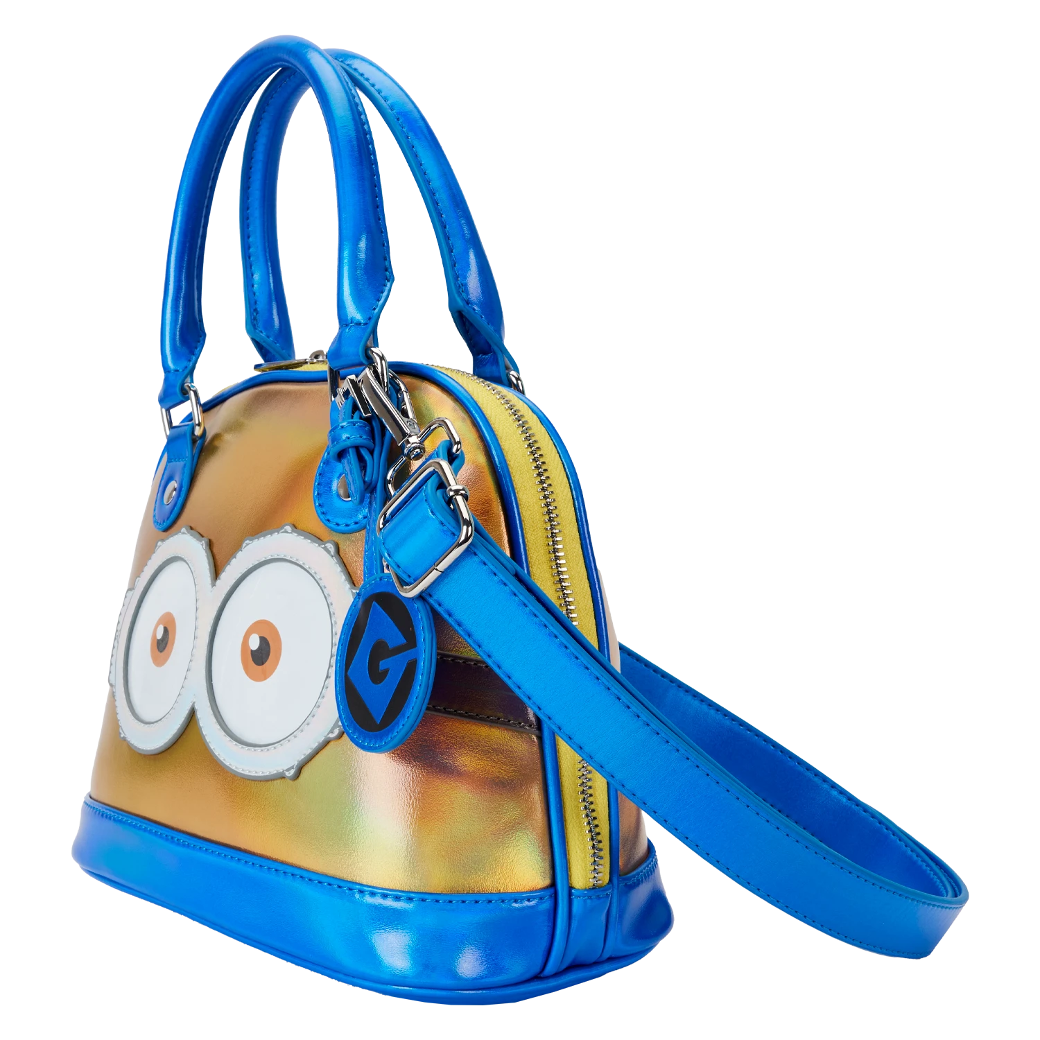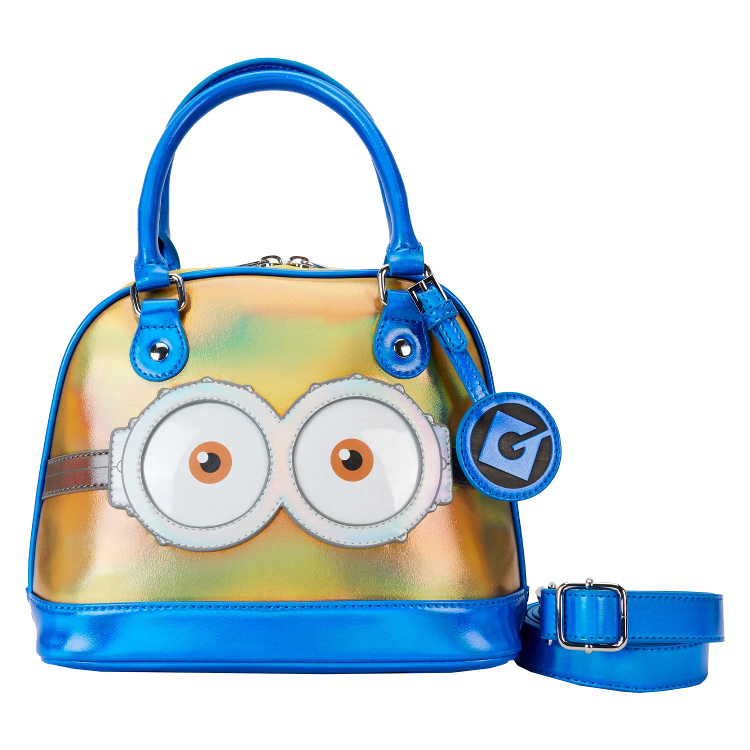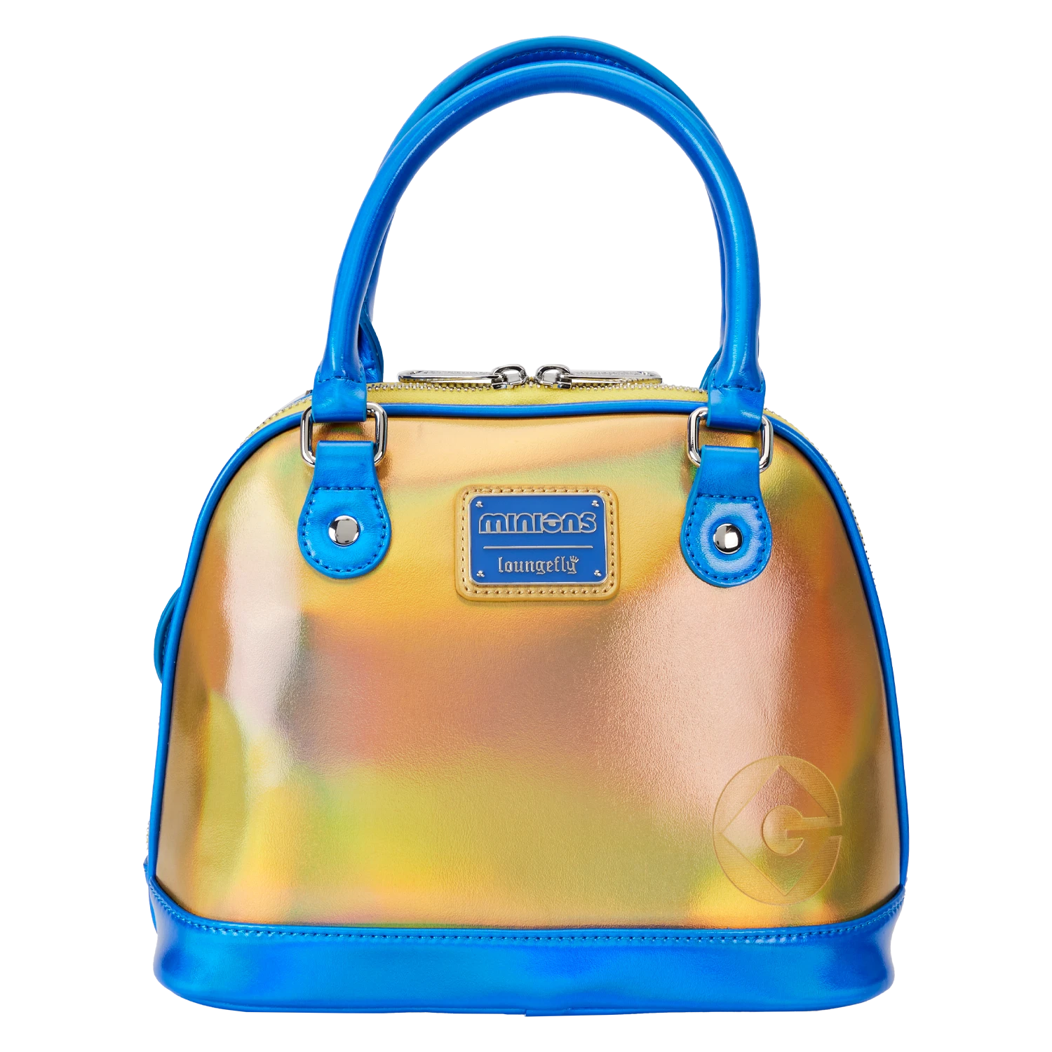 Ooh! Bello! This dome-shaped Minions crossbody bag is ready for some fun. A Minion appears on the front in shiny gold and blue iridescent detail. His big eyes are framed by silver goggles with clear PVC material over the front to create see-through “lenses.” A faux leather charm, in blue, displays a printed image of “Gru’s” symbol, and this symbol makes an embossed encore on the back of the bag, blnding into the gold background. There’s a sturdy blue iridescent handle at the top, and adjustable, detachable straps add versatility and comfort. Extra compartments inside are perfect for securing smaller valuables on your journeys. Pack just what you need for the day to cause some good-natured mischief in style.