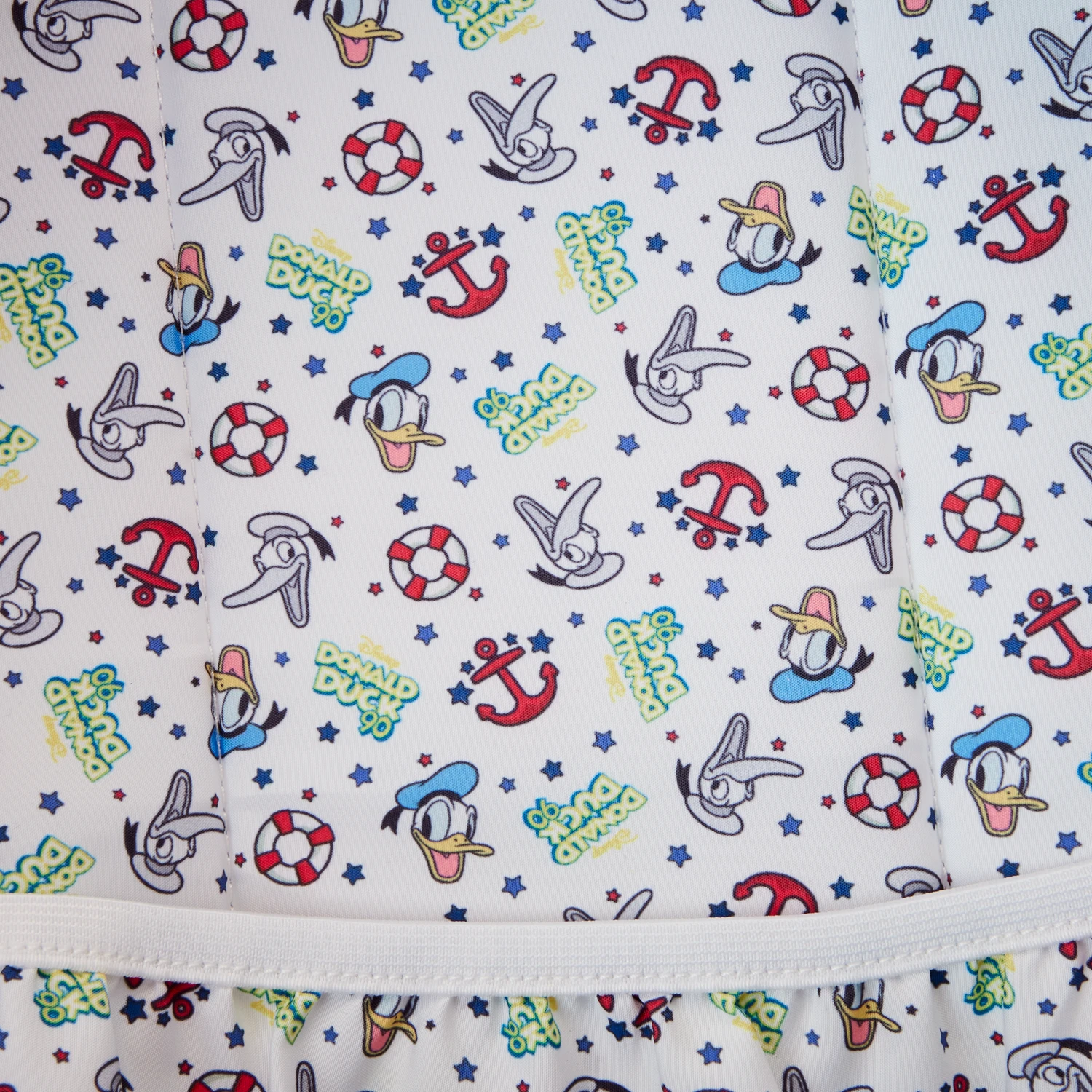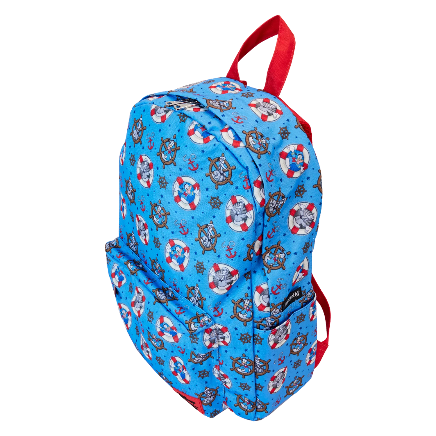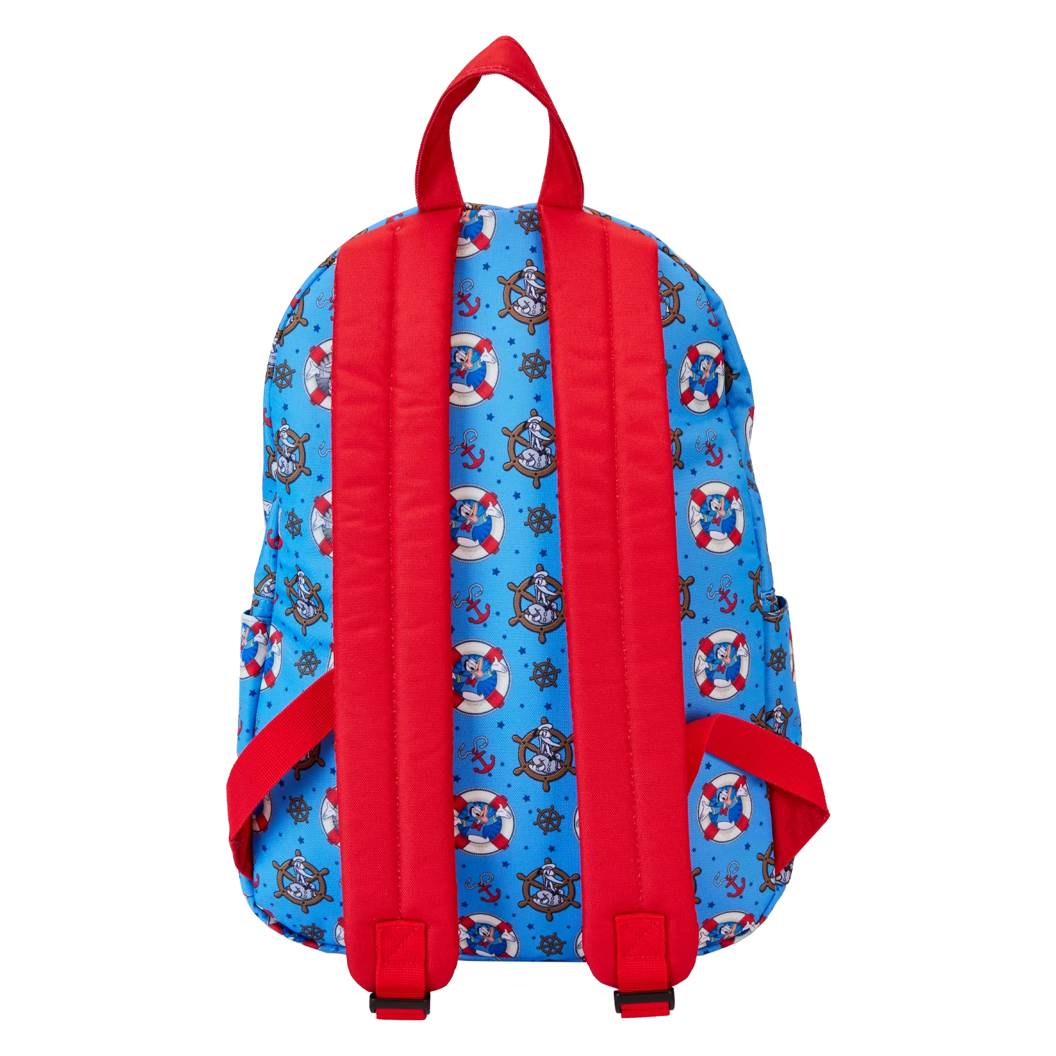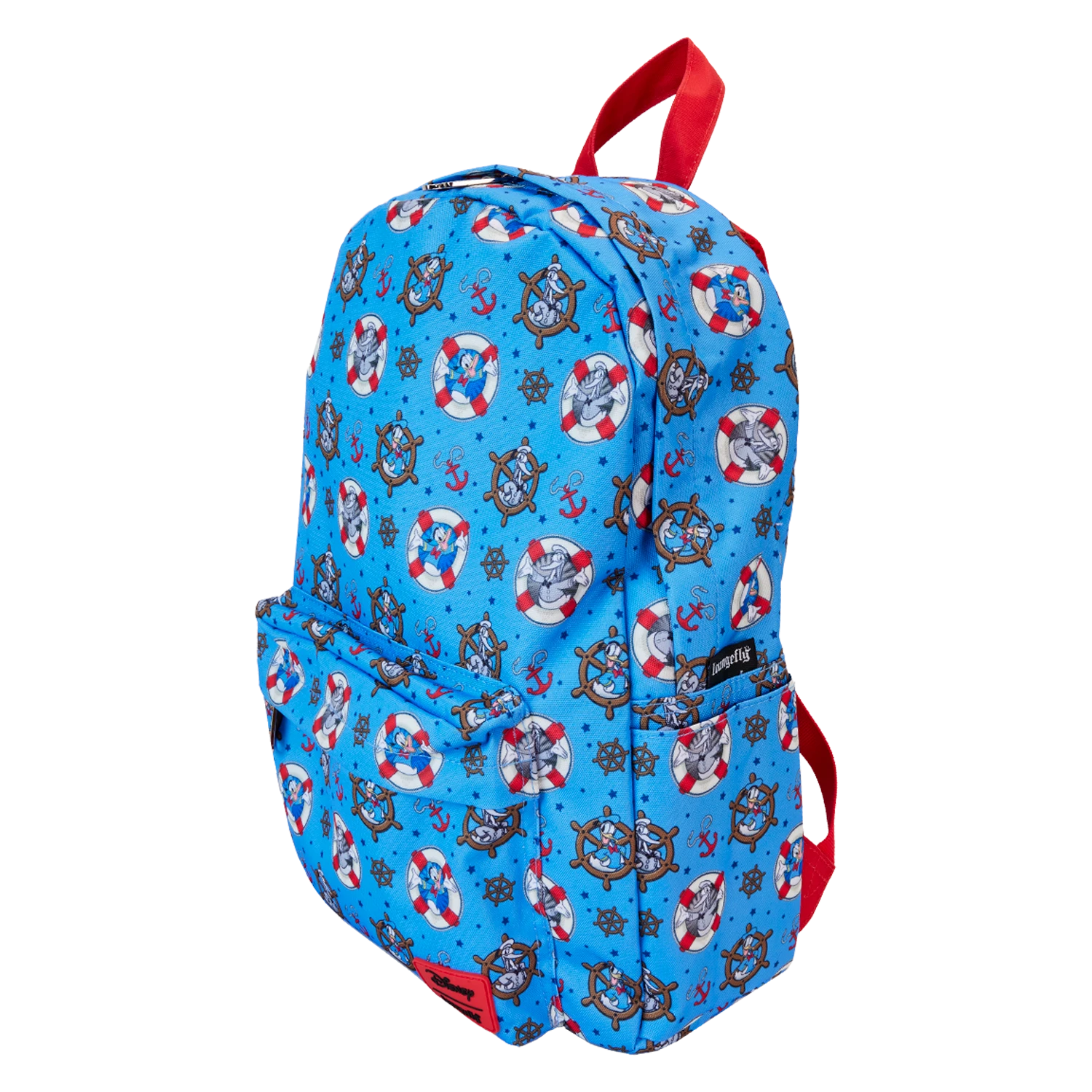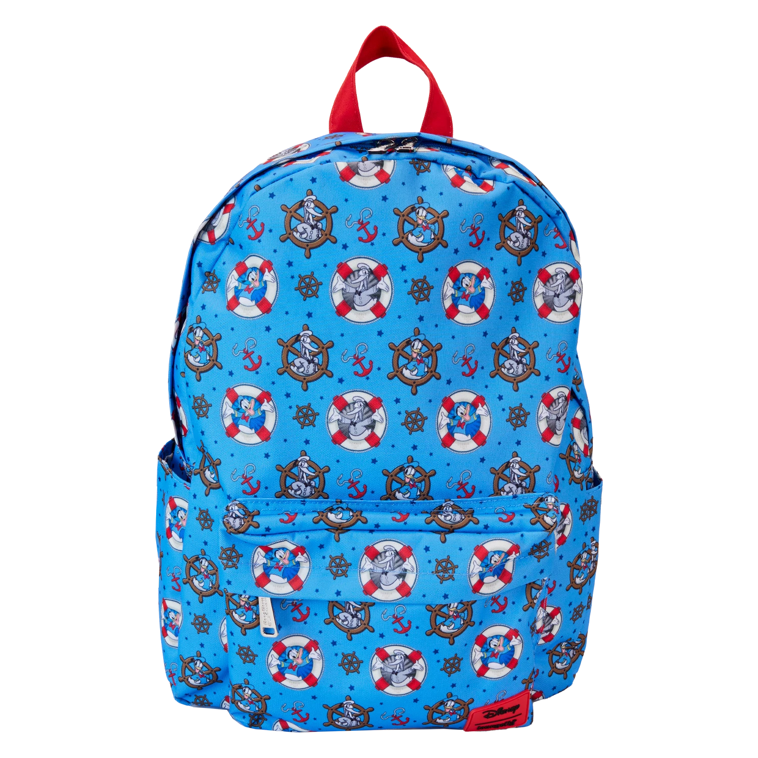 Navigate the fun with your favorite plus one! This full-size backpack is perfect for sailing through your day in character. Disney’s Donald Duck appears as a motif in black and white–and in color. You can find him peeking out from the circle within a life ring–or from the center of the steering wheel of a ship. Other nautical themes accompany him on this blue backpack with red trim. And if you decide to rock the boat, the front pocket is perfect for keeping smaller items secure during your journeys. Make waves while celebrating Donald Duck’s 90th anniversary in style.