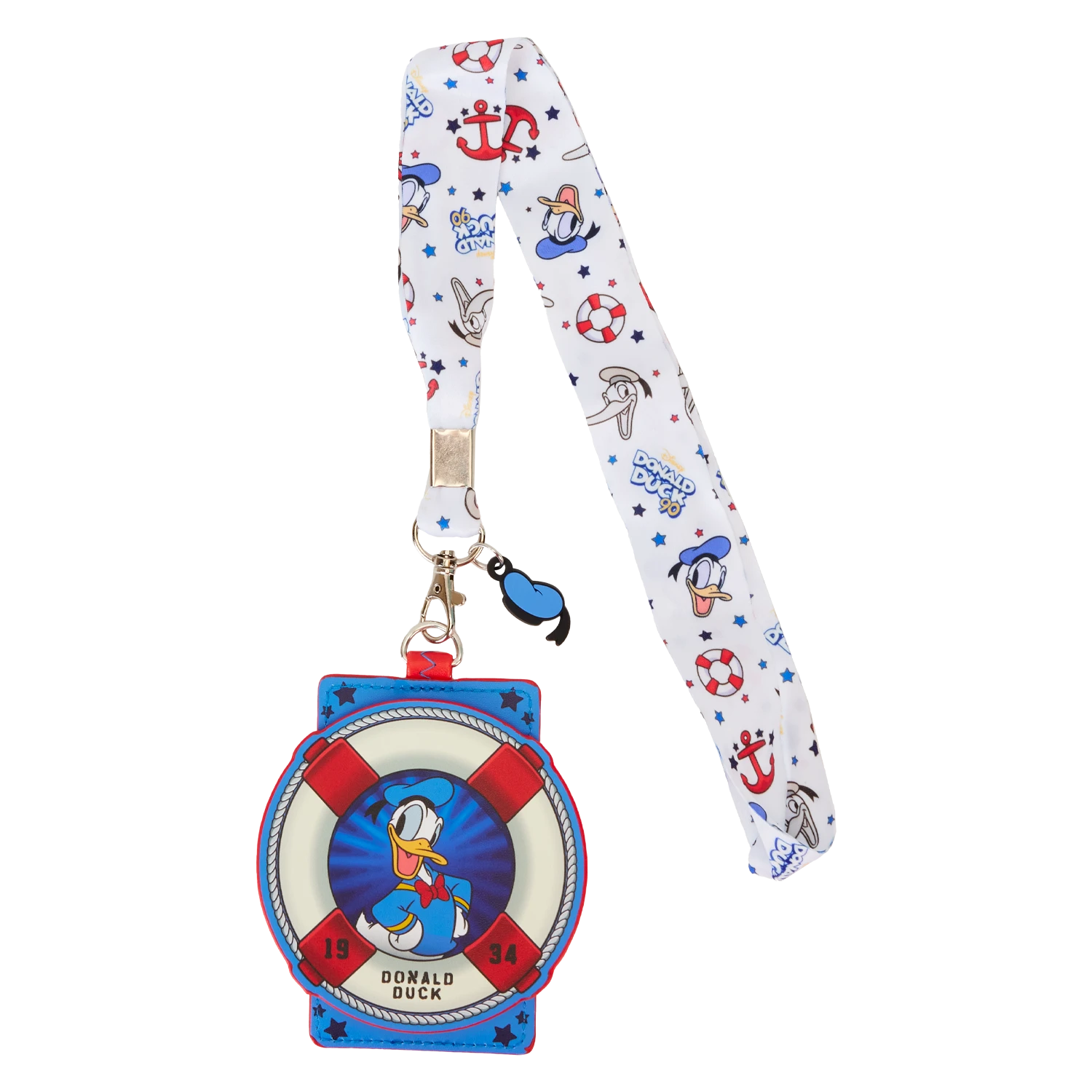 Hoist the anchor and raise the sail! This accessory is ready for adventures! Disney’s Donald Duck is the star of this commemorative and fun lanyard. On the front, a printed, circular-shaped applique of a life preserver appears, and Donald Duck is in the center. His name and date (1934) are printed below. On the back, there’s a clear slot for displaying your ID or badge. The lanyard strap contains a colorful 90th-anniversary motif of Donald Duck in black and white–and in color–along with stars, anchors, and life preservers. A rubber charm of his sailor’s hat tops off the look. Make waves and celebrate Donald Duck’s 90th anniversary in style.