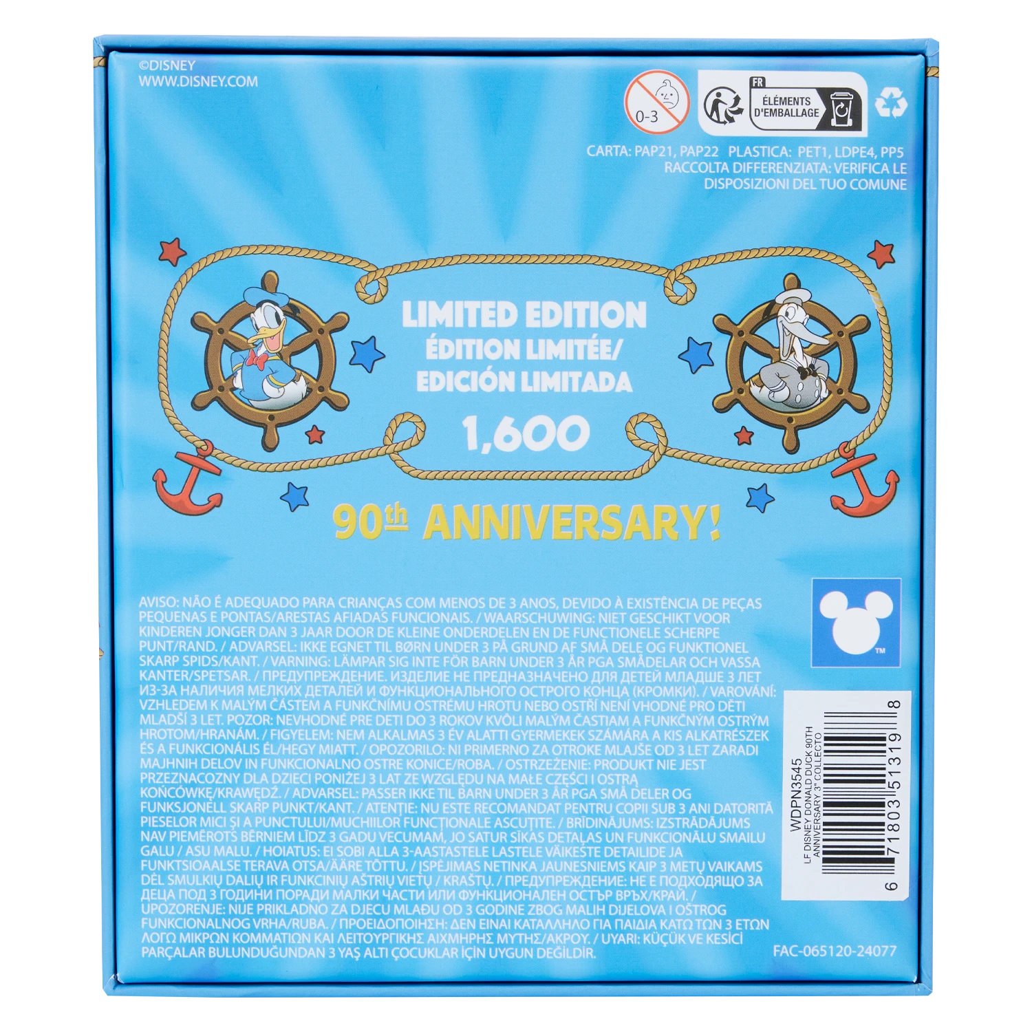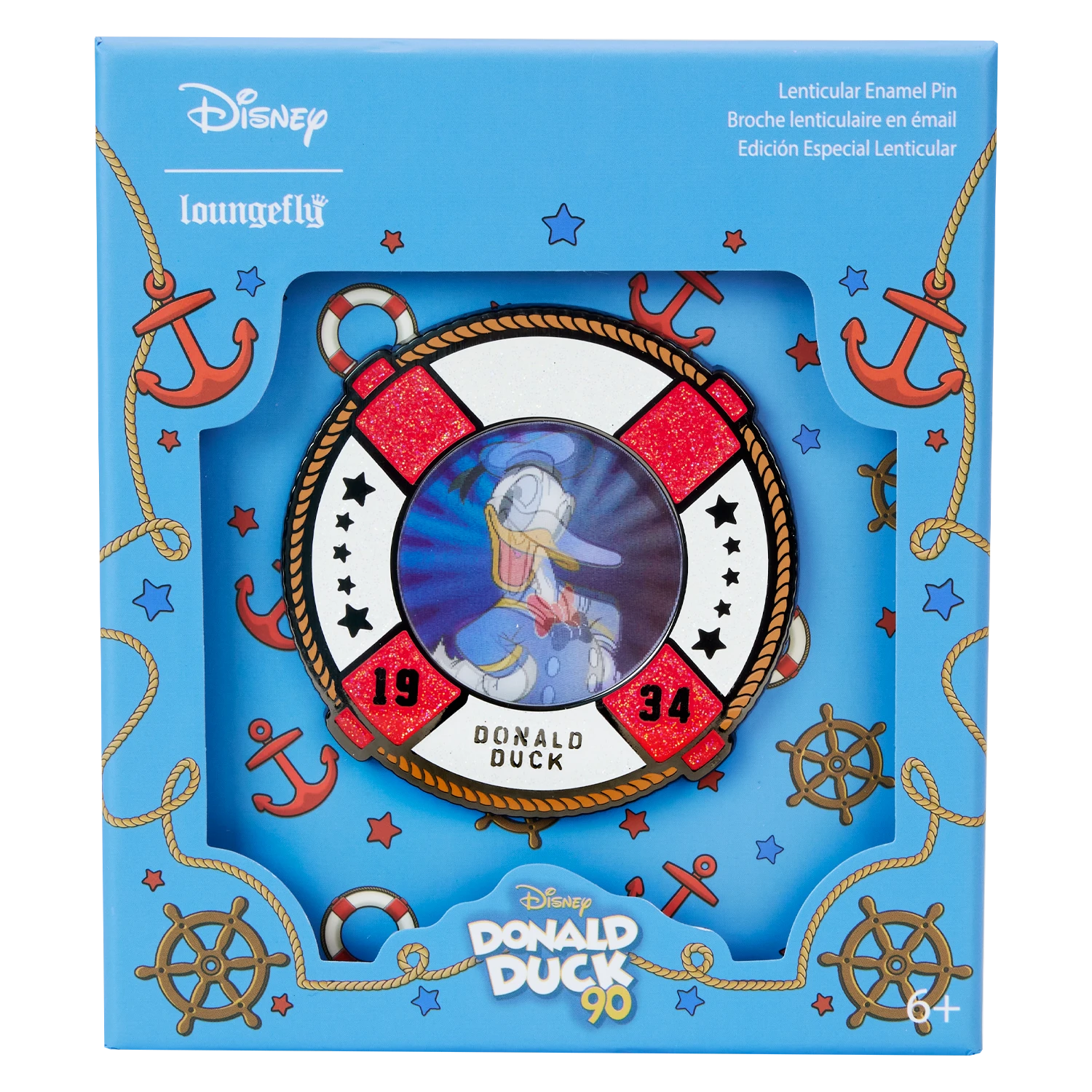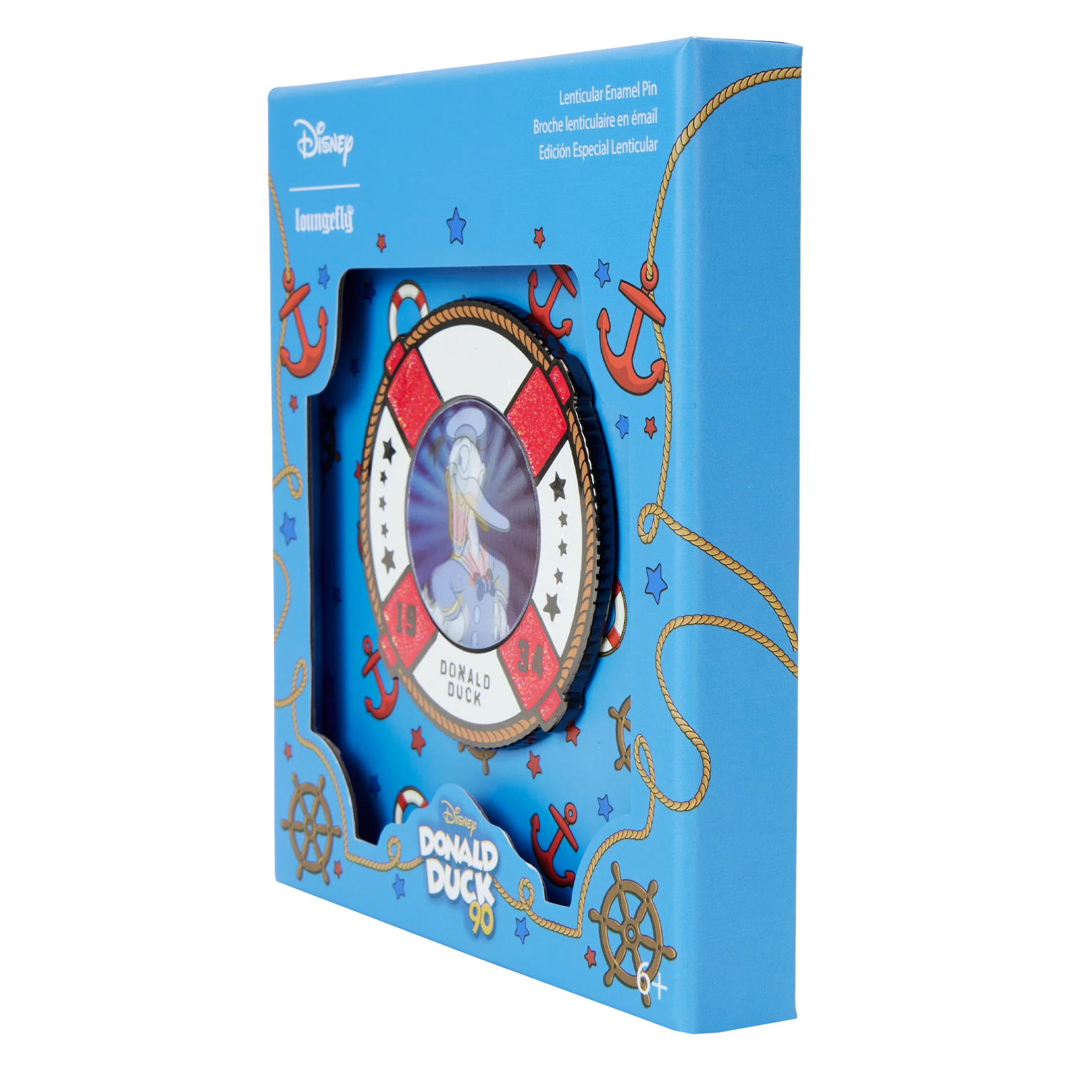 A shipshape pin collection is not complete without a little sparkle. This special collector box pin is ready to sail into your collection. On the front of this circular-shaped pin, Disney’s Donald Duck makes a starring appearance. He’s in the center of a life preserver, and you’ll find his name and date (1934) written below. Donald Duck appears in full color, but with the flick of a wrist (thanks to lenticular features), he also appears in black and white. Glitter decorates the edges of the life ring to add extra shine. Make waves while celebrating Donald Duck’s 90th anniversary.