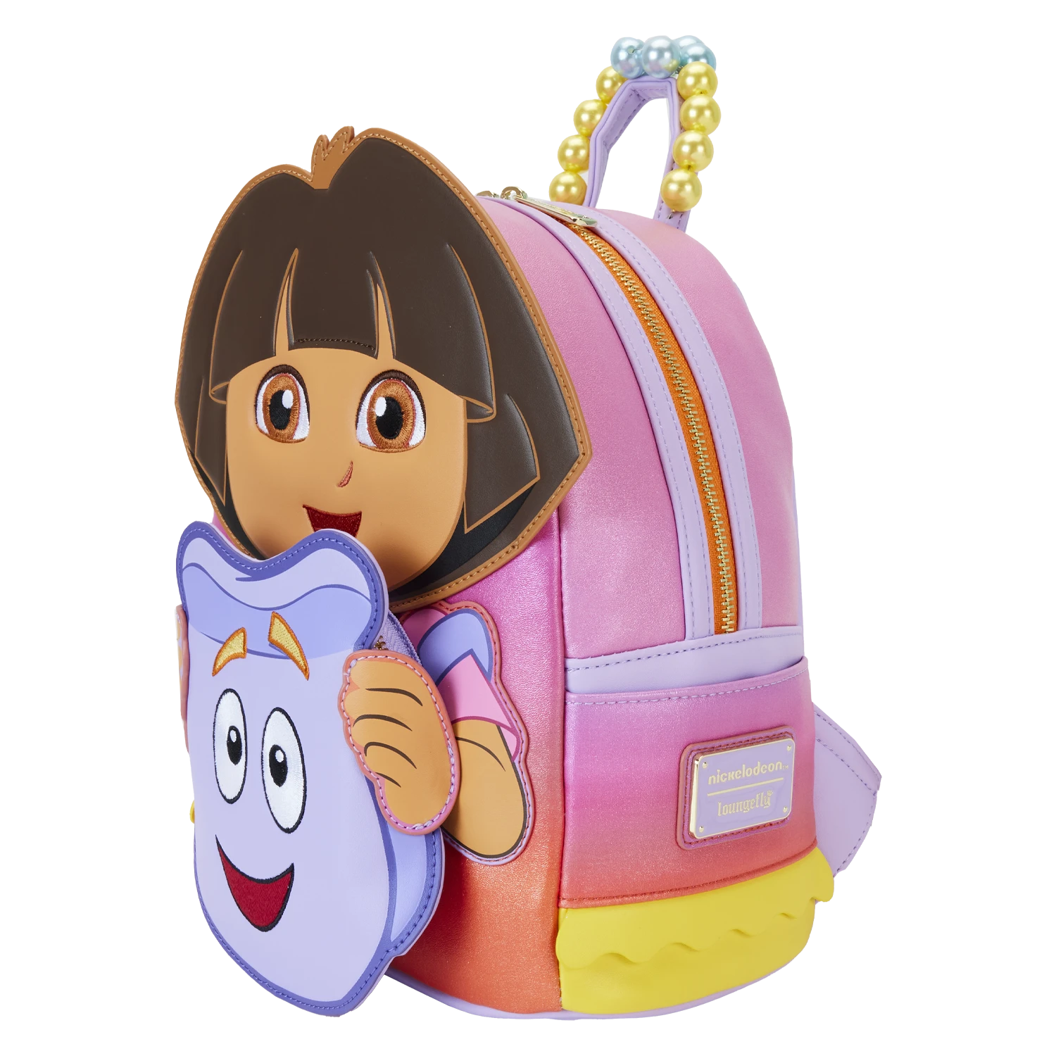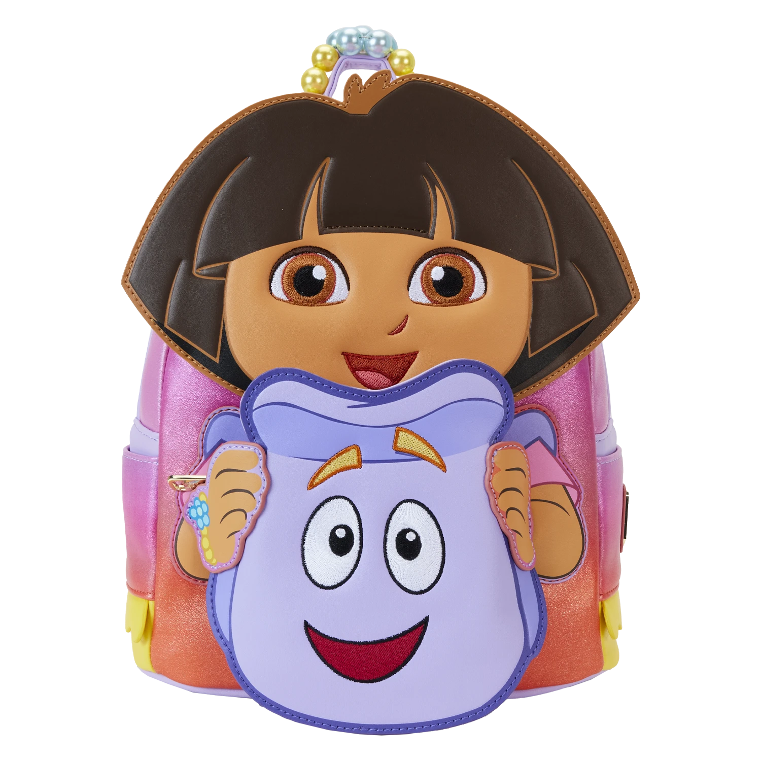 The Loungefly Dora the Explorer Backpack Cosplay Mini Backpack is made of shimmer vegan leather (polyurethane). Backpack has padded adjustable shoulder straps, side pockets, a beaded handle, and gold-colored metal hardware. Additional features include applique, embroidered, printed, and debossed details. Take note of the coordinating inside lining.