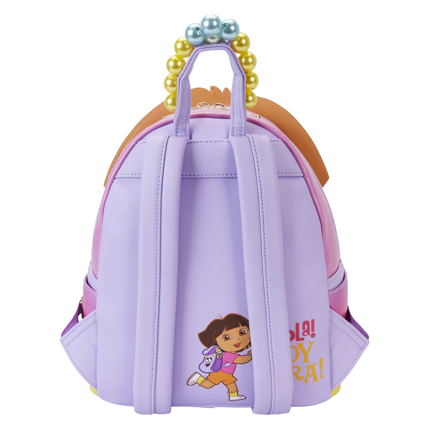 ¡Vámonos! Lead the way with our Loungefly Dora the Explorer Backpack Cosplay Mini Backpack. This fun backpack features none other than Dora’s own Backpack! Get ready to explore all kinds of fun places. Dora’s adorable face pops up over the top of this accessory, and she’s carrying Backpack. A hidden zipper compartment behind Backpack allows you to secure smaller items on your journeys. Embroidery makes Dora’s and Backpack’s facial features come to life. This accessory is colorful, too—covered in shimmery faux leather. On the side pockets, yellow applique ruffles add character. At the top, the handle features colorful molded beads. On the back, Dora makes an encore appearance as a print. She’s dashing off with Backpack, and the words above her read, ¡Hola! ¡Soy Dora! Pack just what you need for the day to take off on all kinds of adventures.