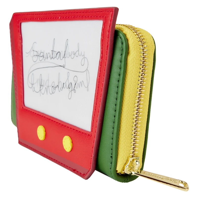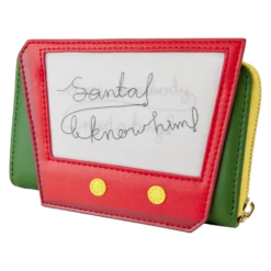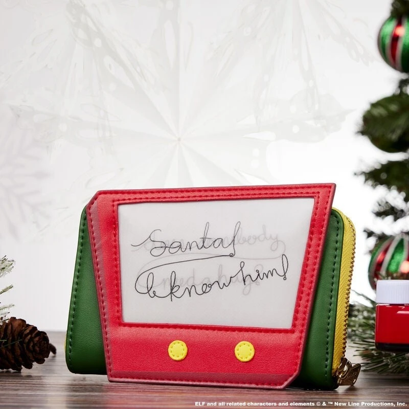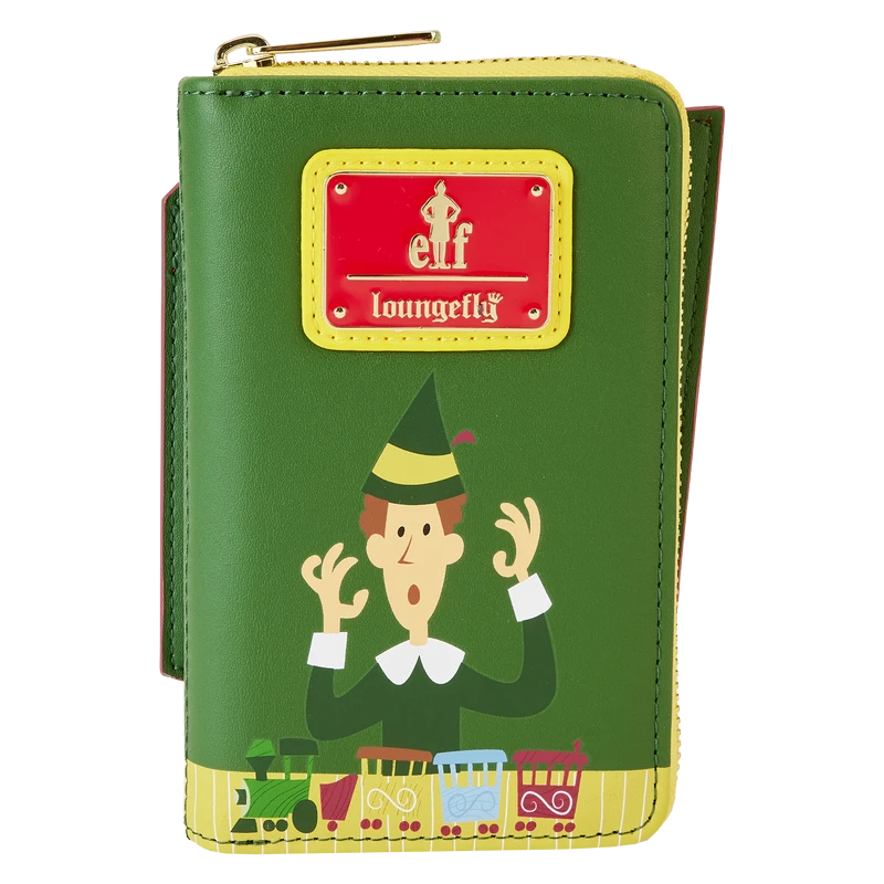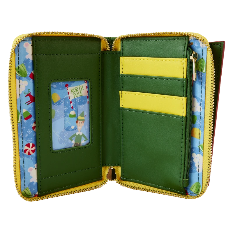 The Elf 20th Anniversary Wallet is made of vegan leather (polyurethane). Wallet zips closed with gold-colored metal hardware. Additional features include applique, debossed, lenticular, and printed details. Take note of the coordinating inside lining.