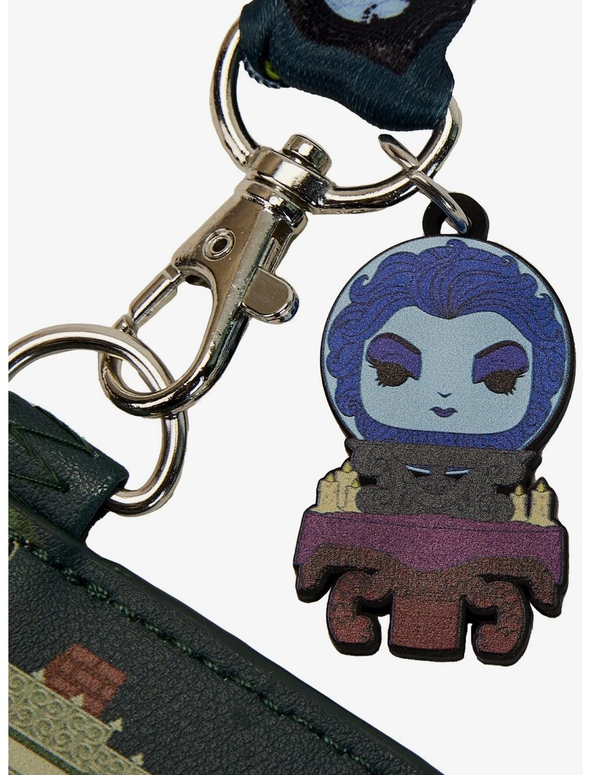 Up above, the printed lanyard displays a motif of ghostly framed portraits against the eerie Haunted Mansion wallpaper. A rubber charm of Madame Leota completes the scene on this spirited accessory. Perfect for on-the-go haunts, this lanyard has plenty of room to display your pin collection while keeping your important items close.