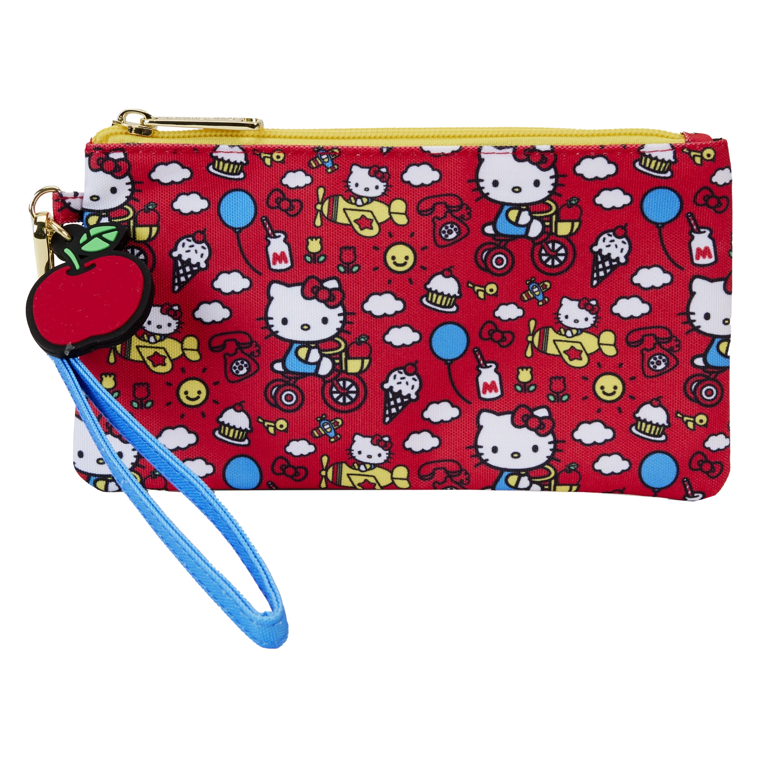 Be a good apple and expand your circle of friends in style! Make friends with our Hello Kitty 50th Anniversary Classic All-Over-Print Nylon Pouch Wristlet Wallet. This fun and handy wristlet features an all-over-print of Hello Kitty, who is having a wonderfully busy day, riding her tricycle and flying a plane. You might also be able to spot balloons, suns, flowers, apples, and more surprises scattered against a classic red background. A silicone zipper charm of an apple tops off the look. The detachable strap is blue, which complements the yellow trim and accents. Inside, you’ll find several convenient slots and pouches for storing valuables safely and organizing smaller items on your journeys.