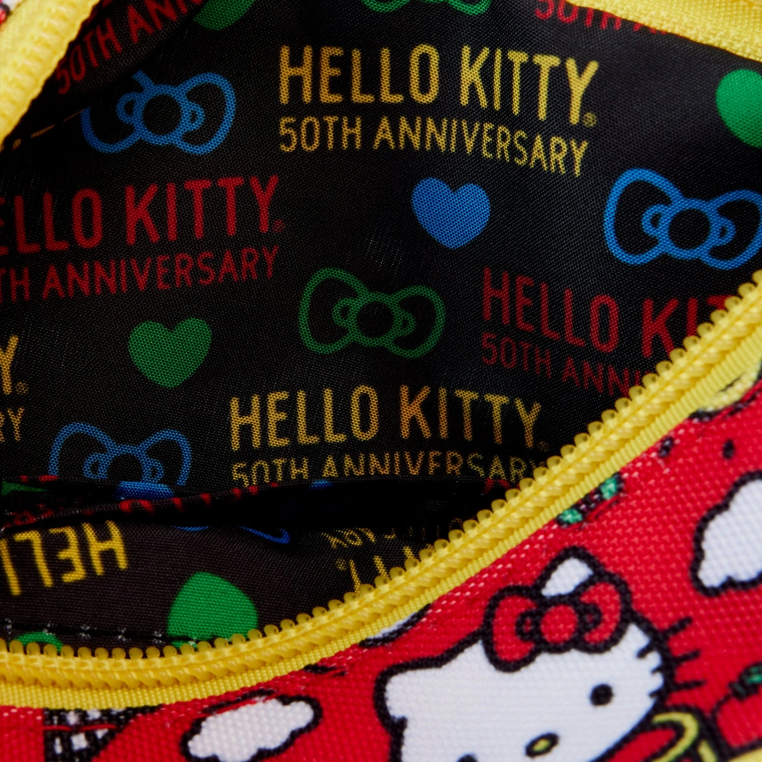 The Hello Kitty 50th Anniversary Classic All-Over-Print Nylon Wristlet Wallet is made of nylon. Wallet zips closed with gold-colored metal hardware. Additional features include printed details and a silicone zipper charm. Take note of the inside lining.