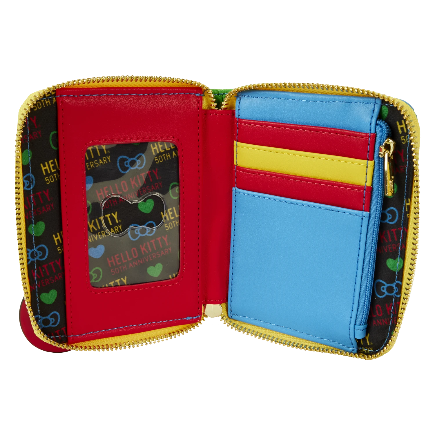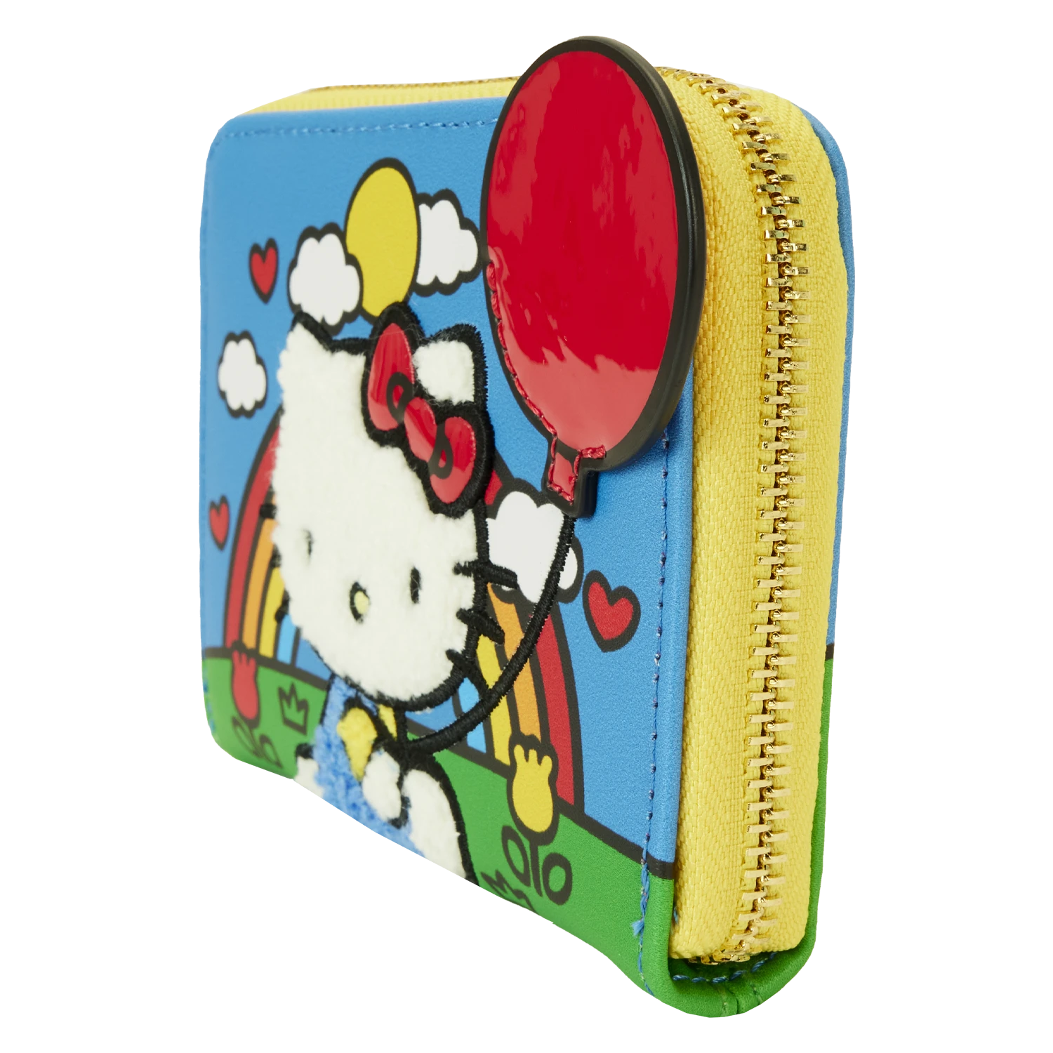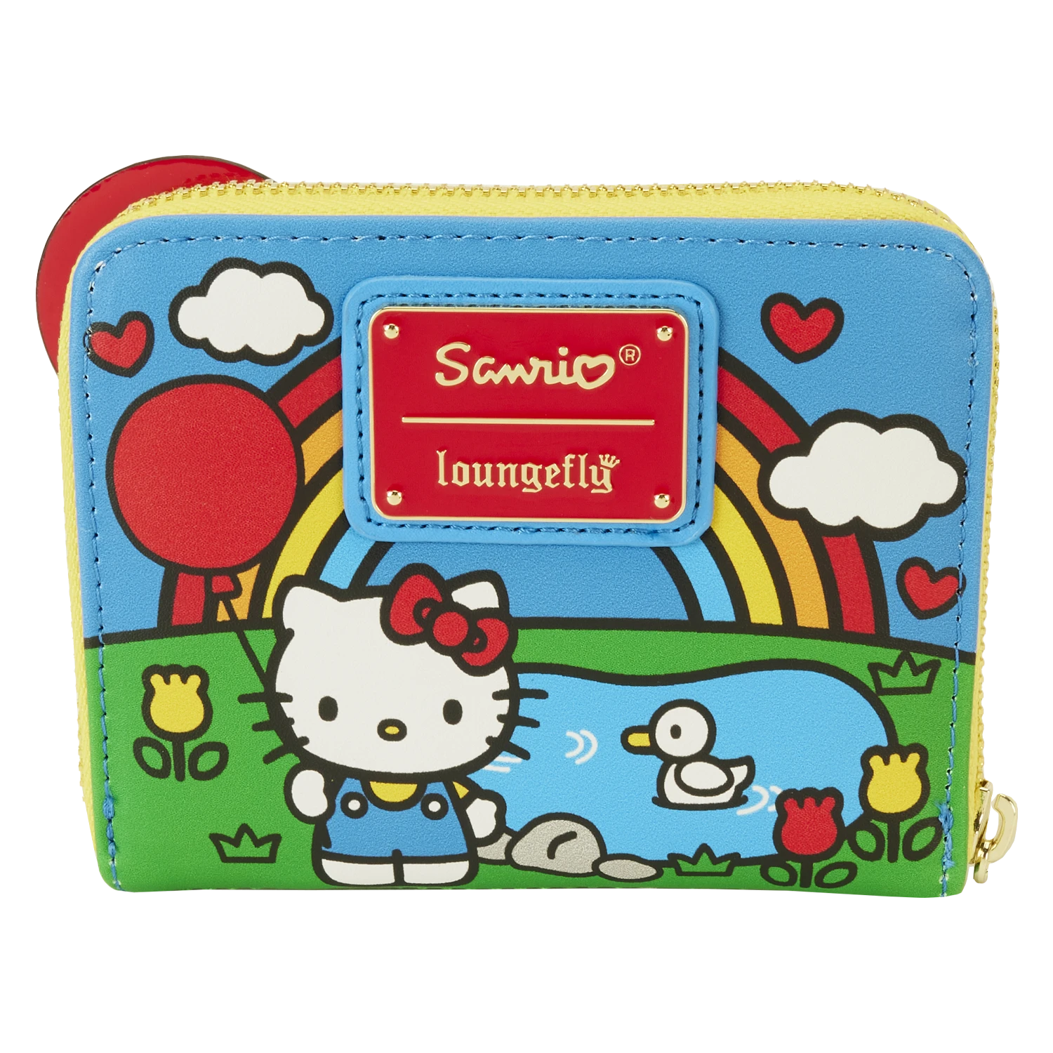 Wave hello wherever you go! Have fun expanding your circle of friends with our Hello Kitty 50th Anniversary Chenille Zip-Around Wallet. Bright, bold colors make this accessory absolutely brilliant. On the front, Hello Kitty appears as an applique chenille patch. She’s holding a red applique balloon, which matches her signature bow. The balloon rises up over the top of the wallet, and in the background, there’s a colorful rainbow in the sky. On the back, Hello Kitty, her balloon, and the rainbow make an encore appearance as printed images, near a delightful duck pond. Inside, you’ll find approximately four slots for holding cards and one clear slot for displaying your ID. The die-cut shape of a bow adds a characteristic touch.