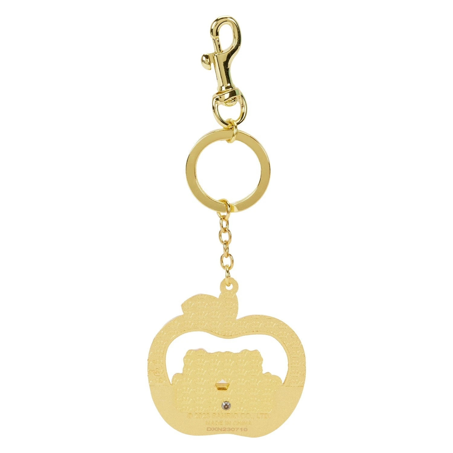 Enamel keychain has sliding part details and shiny gold hardware.