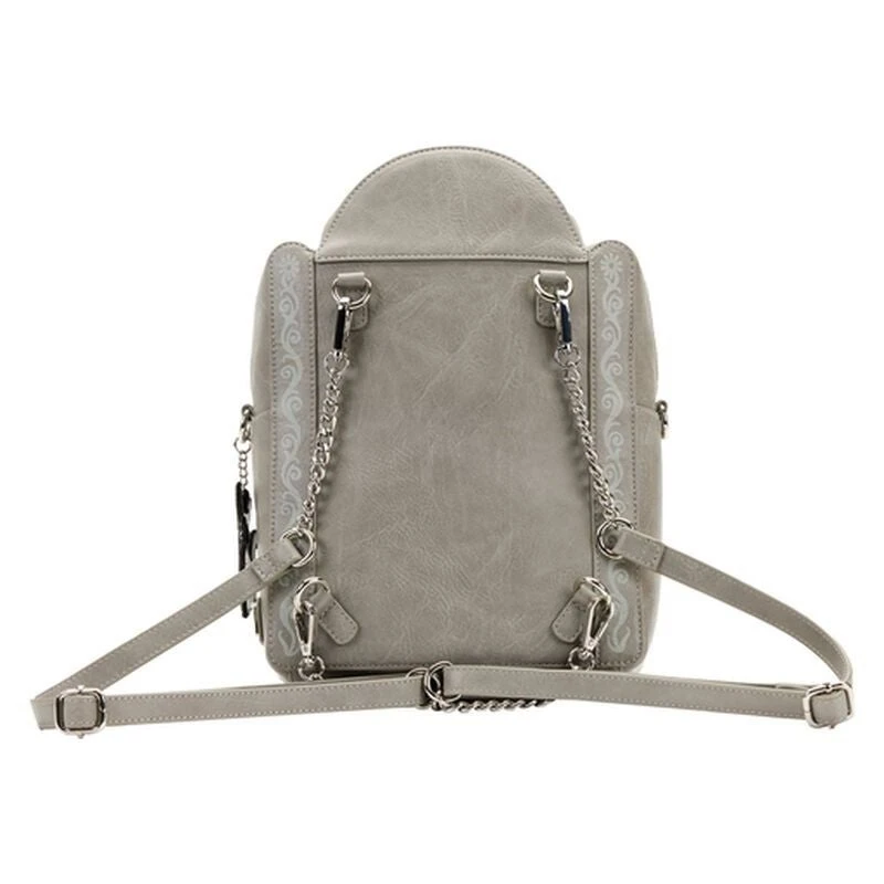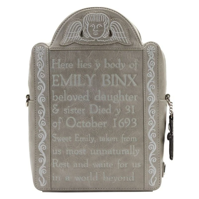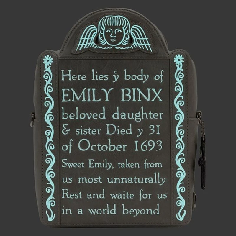 The exclusive Stitch Shoppe by Loungefly Hocus Pocus Here Lies Emily Binx Convertible Crossbody Bag is made of vegan leather (polyurethane). Bag has sturdy hardware and adjustable shoulder straps (removeable) that can convert into a backpack. Additional features include applique, debossed, embroidered, glow-in-the-dark, and printed details.