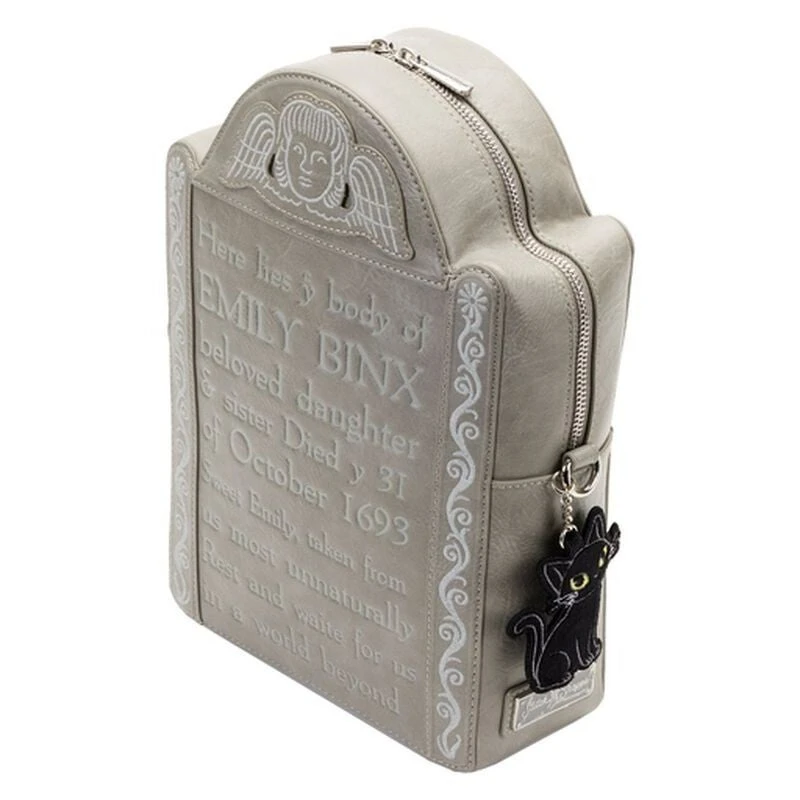 Celebrate the power of All Hallows’ Eve with the exclusive Disney Stitch Shoppe by Loungefly Hocus Pocus Here Lies Emily Binx Convertible Crossbody Bag. This interchangeable accessory forms of the headstone of Emily Binx, the late sister of Thackery. On the front, an engraved epitaph glows in the dark as it describes Emily’s early fate from the wicked Sanderson Sisters. Glow-in-the-dark embroidery highlights the grave’s details, and Thackery Binx appears nearby as a velvet bag charm to guard his sister’s spirit.