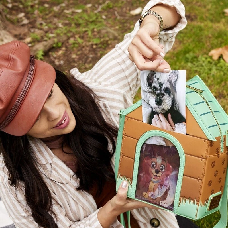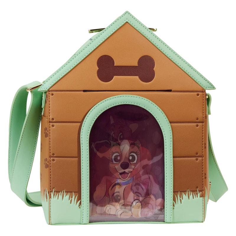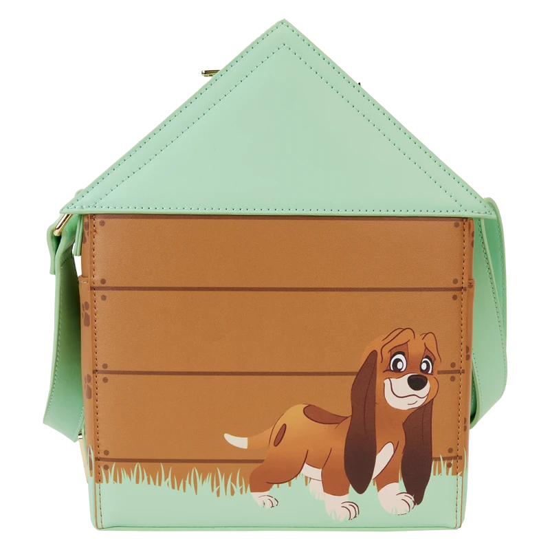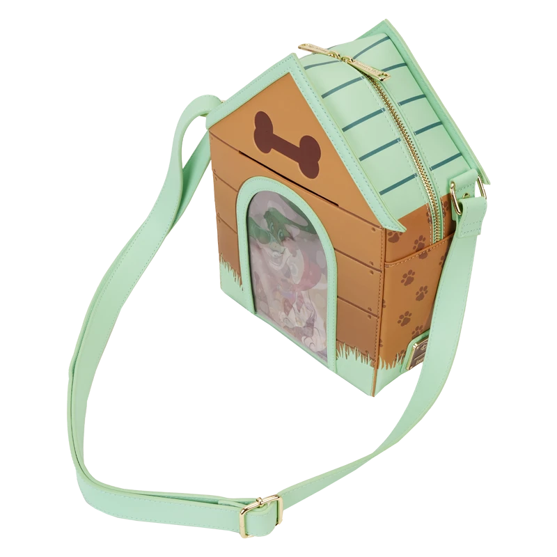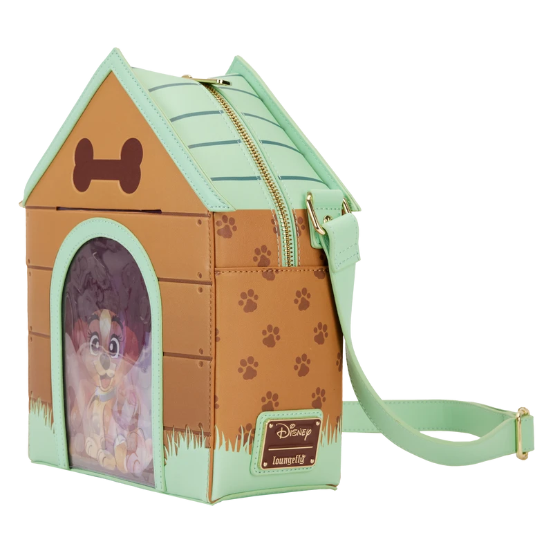 Paws for a picture-perfect moment! The I Heart Disney Dogs Triple Lenticular Crossbody Bag is ready to embark on journeys full of fun memories. This fully figural accessory is shaped like a doghouse. Lenticular details on the door reveal three different Dogs: Lady, a Dalmatian puppy, and Dodger. You can even place a photo of your pet behind the door for a more personalized touch. Various Dogs appear as a debossed print above the doghouse. A paw-print motif covers the side panels, and on the back, Copper plays in the grass. Enjoy a stroll through the park with this treat of an accessory.