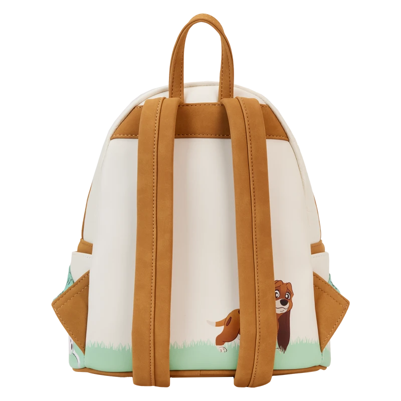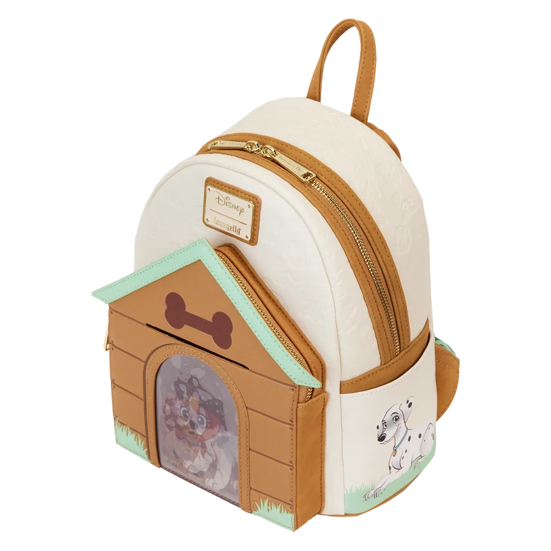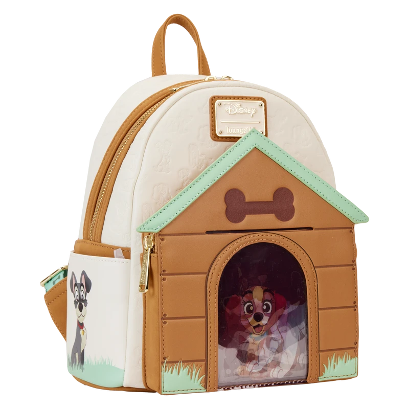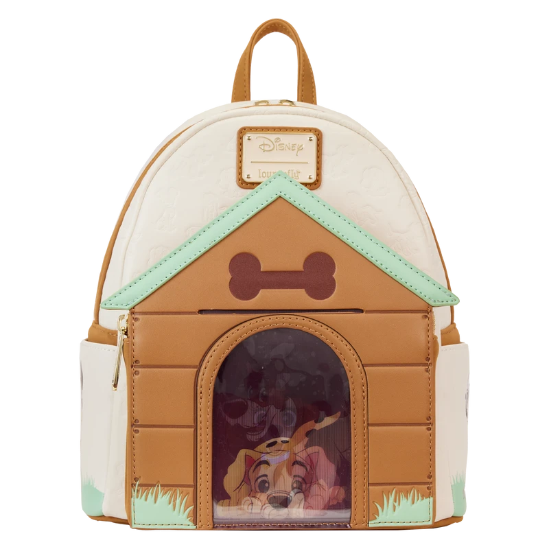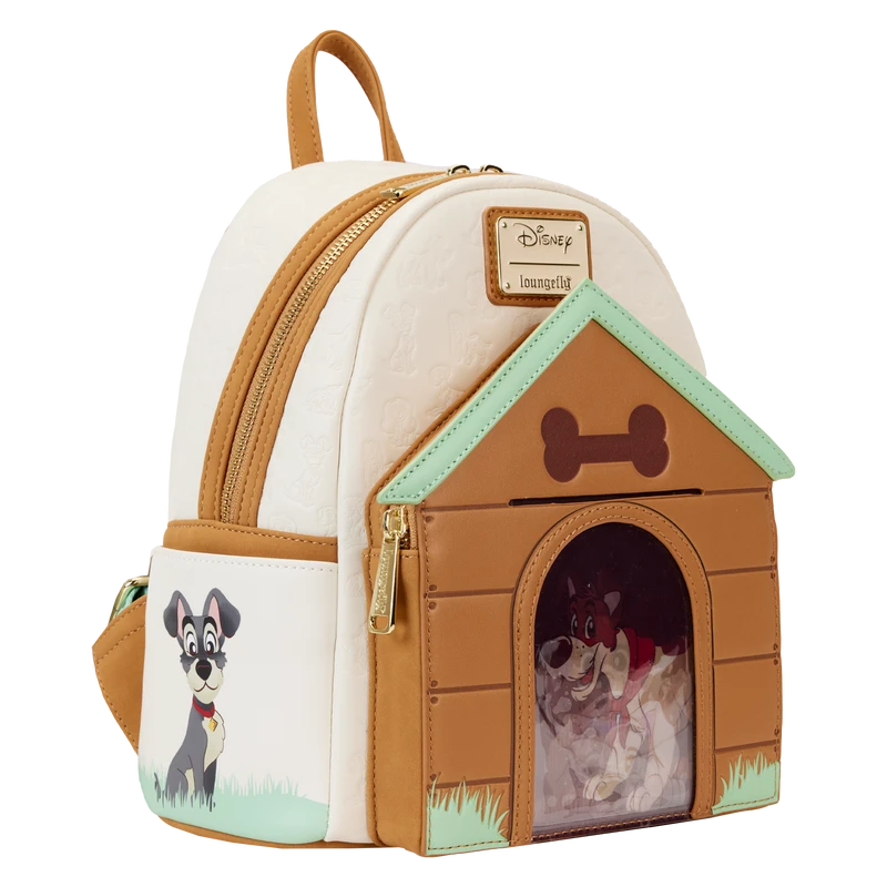 Paws for a picture-perfect moment! The I Heart Disney Dogs Triple Lenticular Mini Backpack is ready to embark on journeys full of fun memories. On the front of this accessory, a fully figural doghouse takes shape over the front pocket. Lenticular details on the door reveal three different Dogs: Lady, a Dalmatian puppy, and Dodger. You can even place a photo of your pet behind the door for a more personalized touch. Various Dogs appear as a debossed print above the doghouse as well. On the side pockets, you’ll find Perdita and The Tramp. On the back, Copper plays in the grass. Even the straps include a motif of bones and paw prints. Enjoy a stroll through the park with this treat of an accessory.