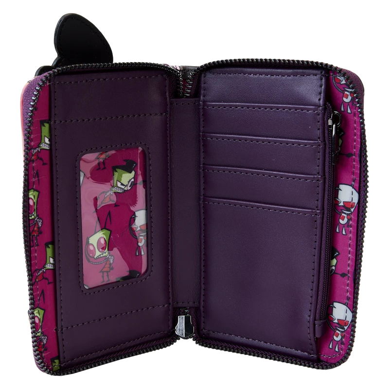 The Loungefly Invader Zim Secret Lair Zip Around Wallet is made of vegan leather (polyurethane). Wallet zips closed with gunmetal-colored hardware. Additional features include applique, debossed, and printed details. Take note of the coordinating inside lining.