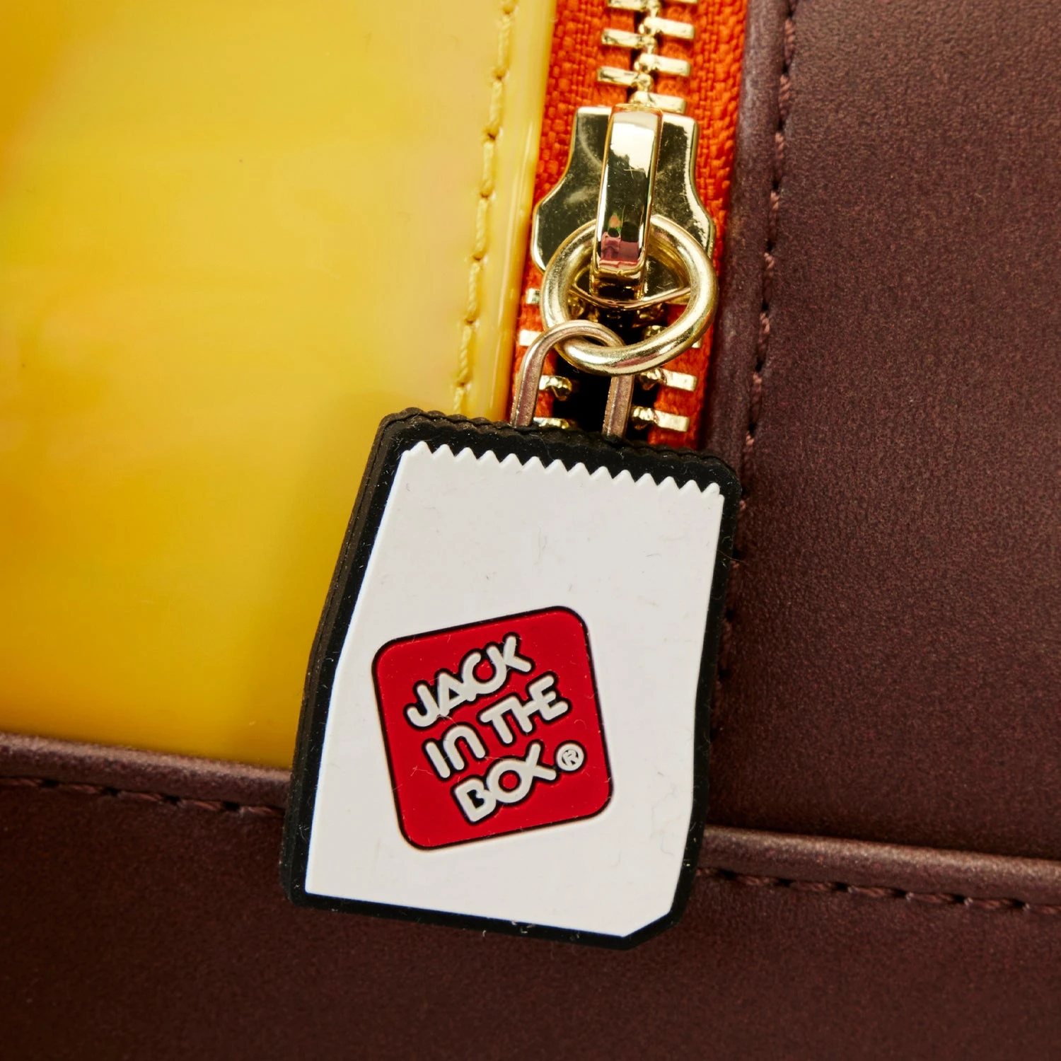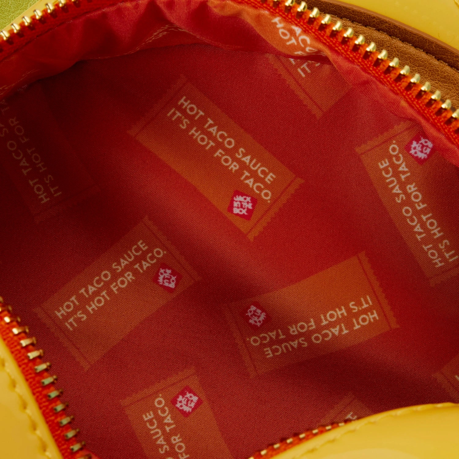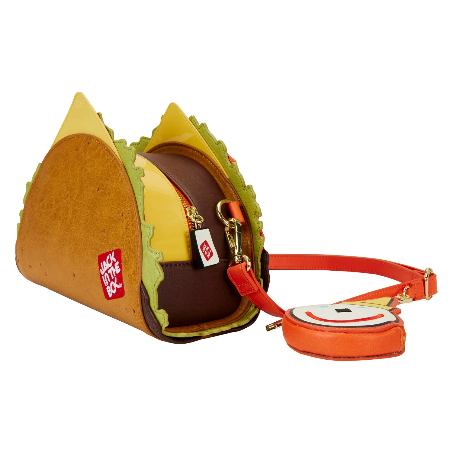 The Jack in the Box Late Night Taco Crossbody Bag is made of vegan leather (polyurethane). Bag has adjustable (detachable) shoulder strap, detachable coin bag, and shiny gold hardware. Additional features include applique, debossed, embossed, embroidered, and printed details. Take note of the coordinating inside lining.