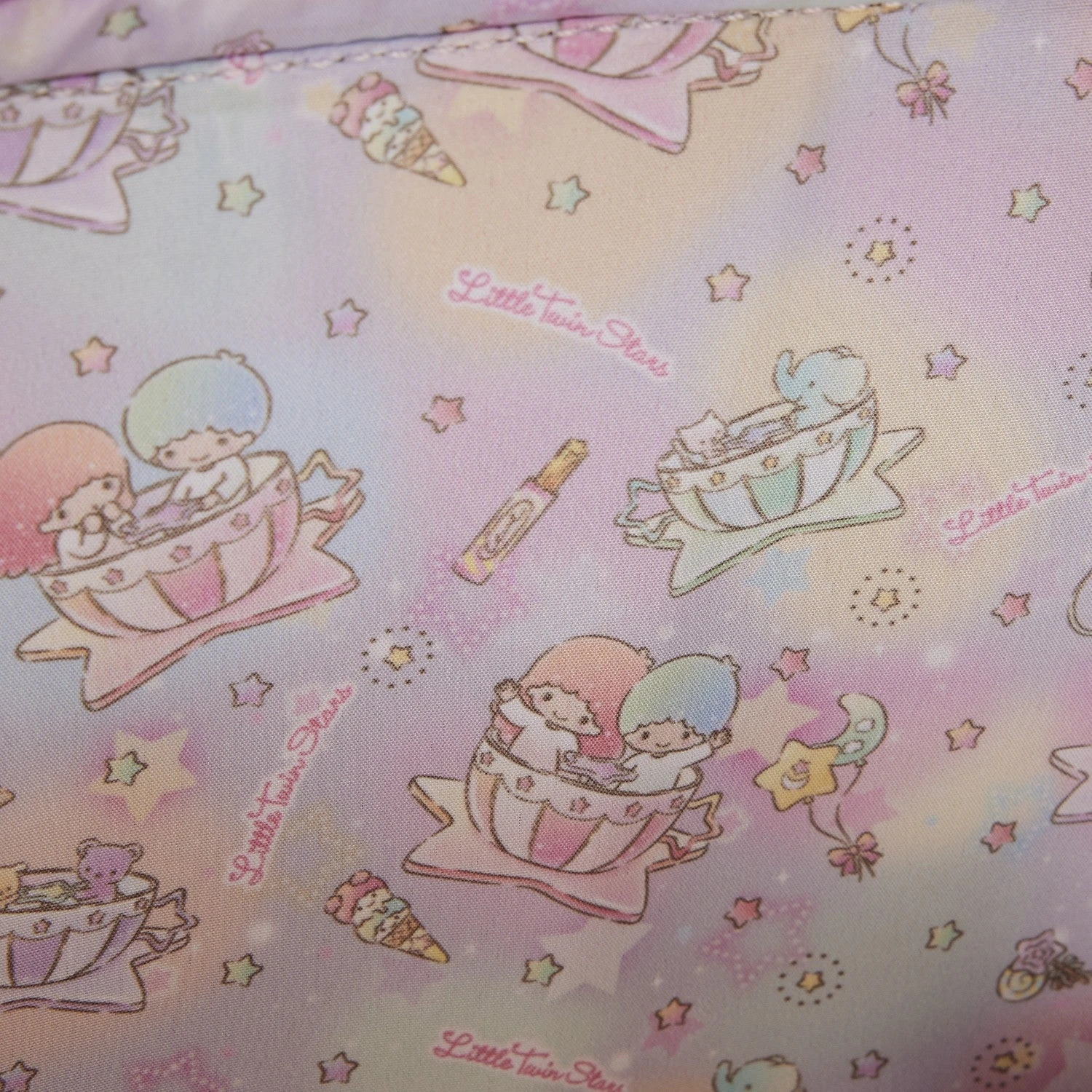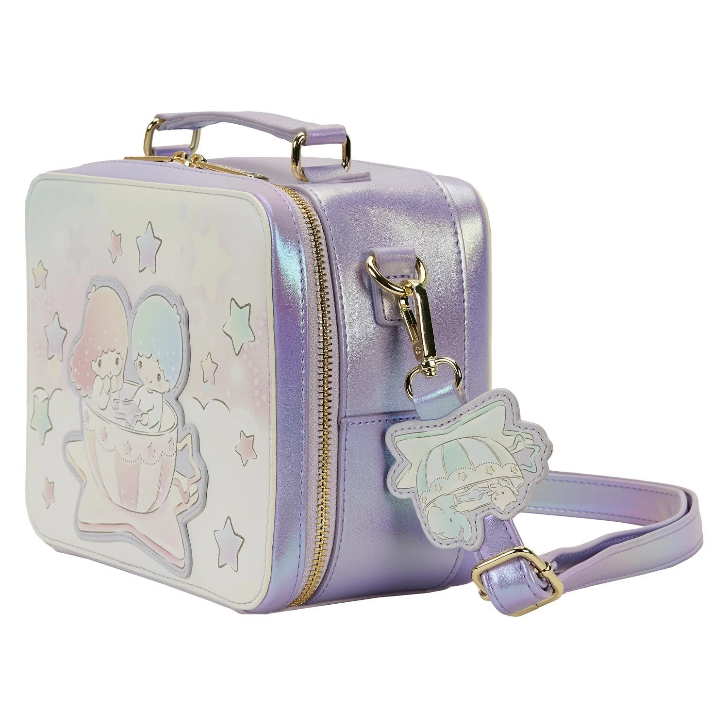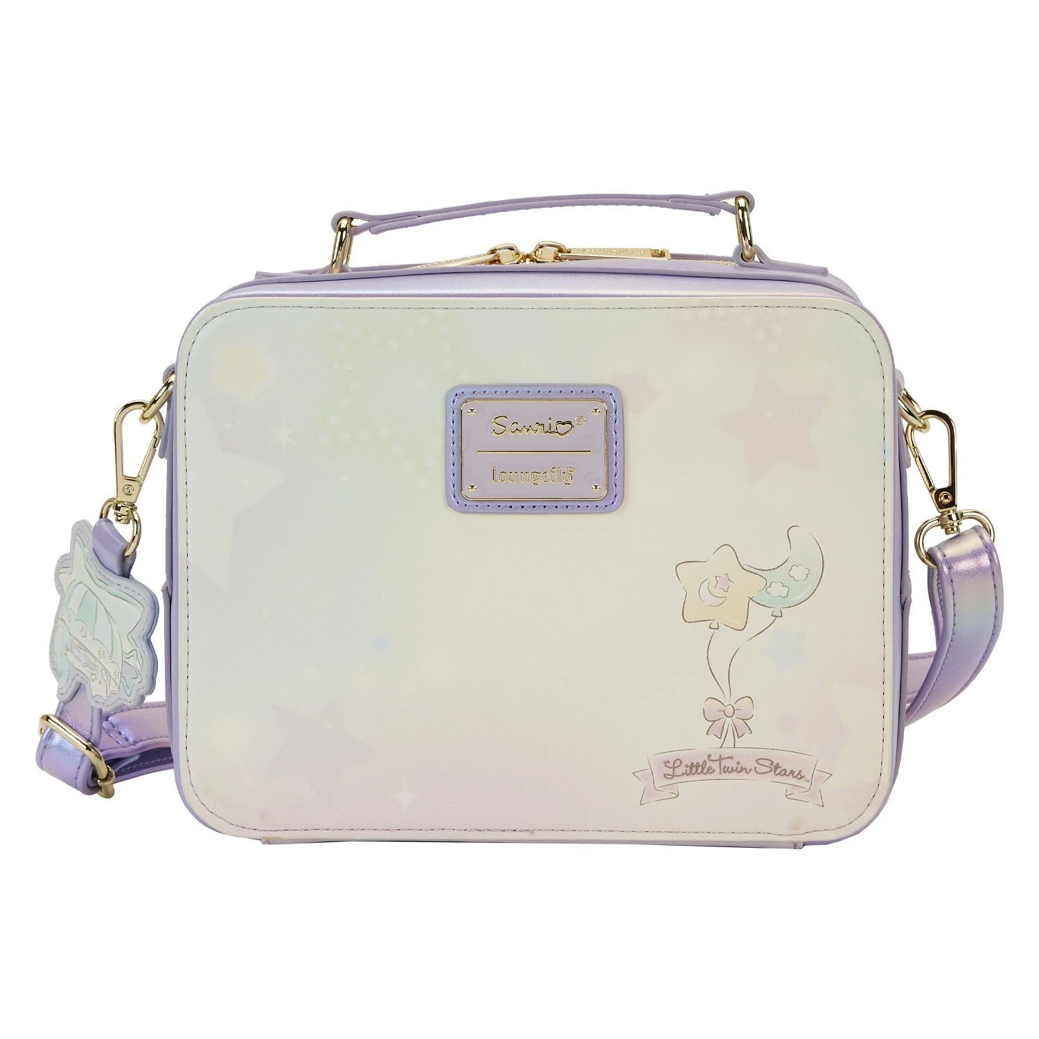 The Loungefly Little Twin Stars Carnival Crossbody Bag is made of vegan leather (polyurethane) with iridescent trim. Bag has adjustable (detachable) shoulder strap and shiny gold hardware. Additional features include applique, debossed, iridescent, and printed details. Take note of the coordinating inside lining.