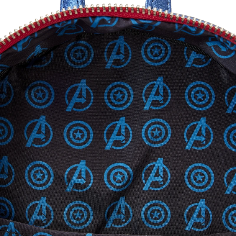 The Loungefly Marvel Metallic Captain America Cosplay Mini Backpack is made of vegan leather (polyurethane). Bag has adjustable, removable straps and sturdy silver-colored metal hardware. Additional features include applique, debossed, glitter, metallic, iridescent, and printed details. Take note of the coordinating inside lining.