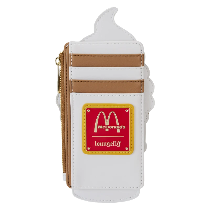 The McDonald’s Soft Serve Ice Cream Cone Holder is made of vegan leather (polyurethane). Card holder zips closed with shiny gold hardware. Additional features include applique, debossed, and printed details.