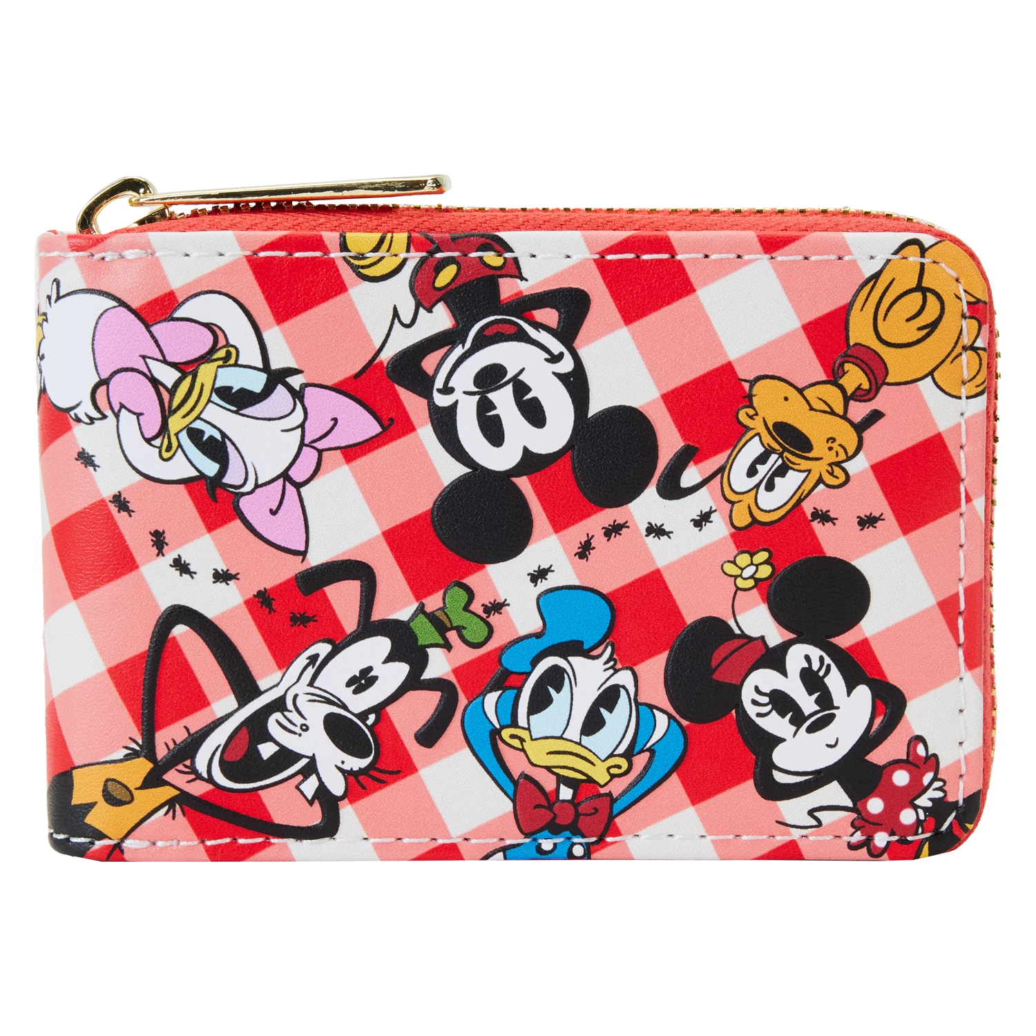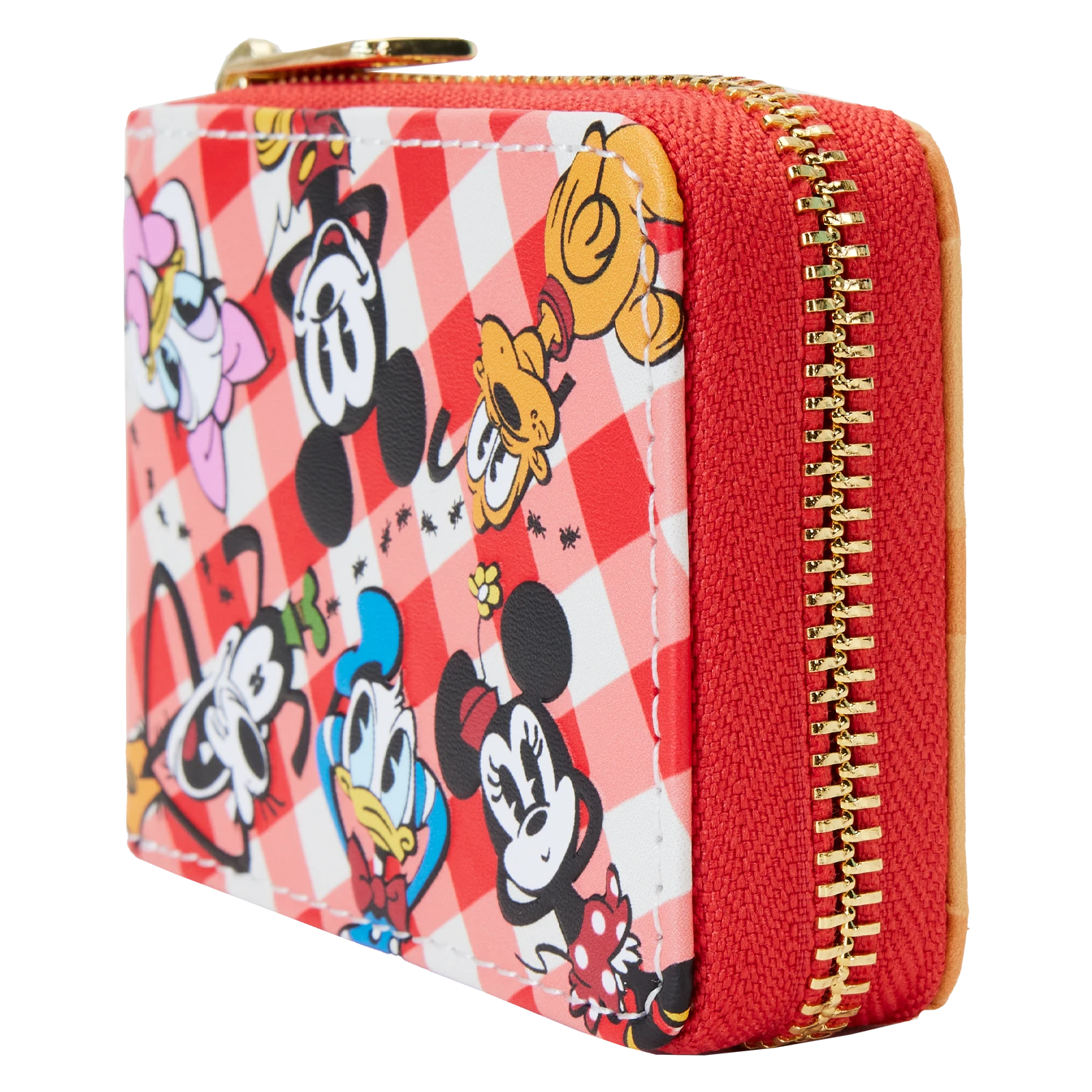 The Loungefly Mickey and Friends Picnic Accordion Wallet is made of vegan leather (polyurethane). Wallet zips closed with shiny gold hardware. Additional features include debossed and printed details. Take note of the coordinating inside lining.