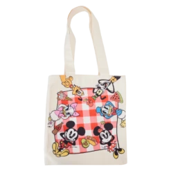 The Loungefly Mickey and Friends Picnic Canvas Tote Bag is made of recycled canvas material and features printed details.