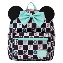 Select a song from the jukebox and prepare to dance! The Mickey Mouse and Minnie Mouse Date Night Diner All-Over-Print Nylon Mini Backpack is ready for fun. This backpack features an all-over black-and-white checkered pattern, reminiscent of a dance floor in a 1950s diner. Inside the white checkered boxes, you’ll find printed images of records, jukeboxes, Mickey Mouse and Minnie Mouse, popcorn, and ice cream sundaes. Signature Mickey Mouse ears also pop up on top. Accents of teal, including a 3D bow, add a retro pop of color, and a front zipper compartment secures smaller items for your journey. Bring your plus one, and this backpack, to kick up your heels in style.