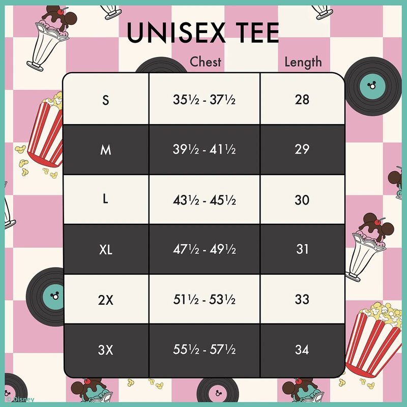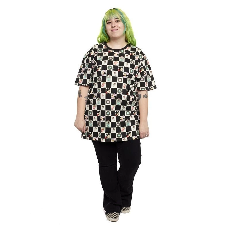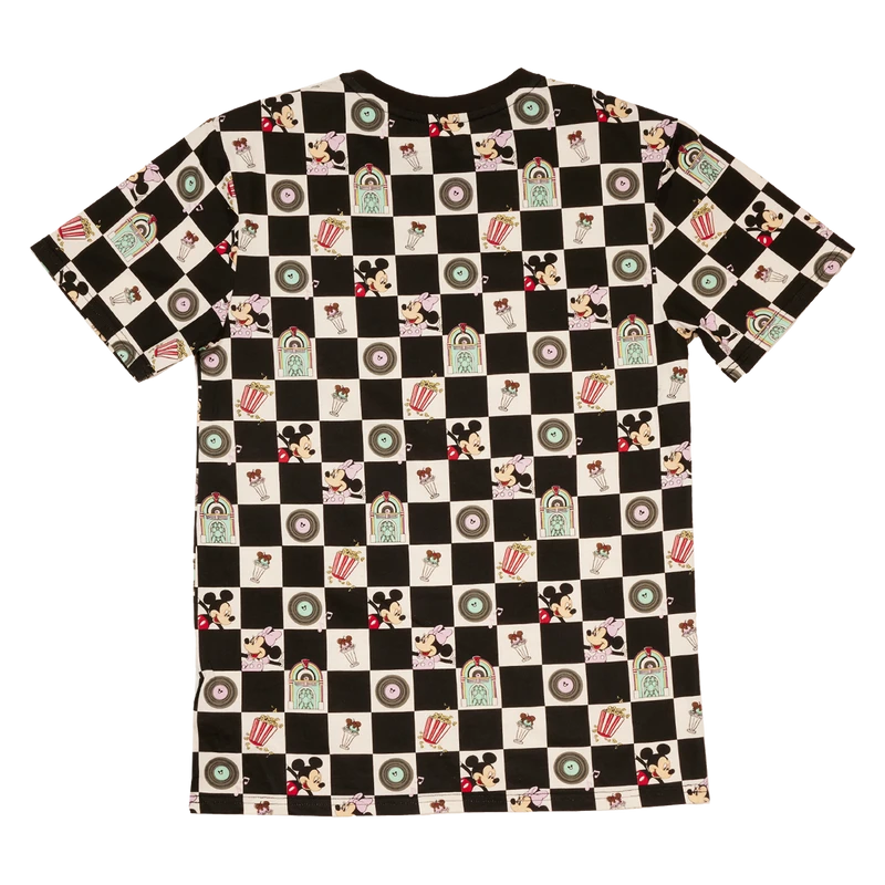 The Mickey Mouse and Minnie Mouse Date Night Diner Checkered Unisex Tee features a roller print and is made of 100% cotton jersey.