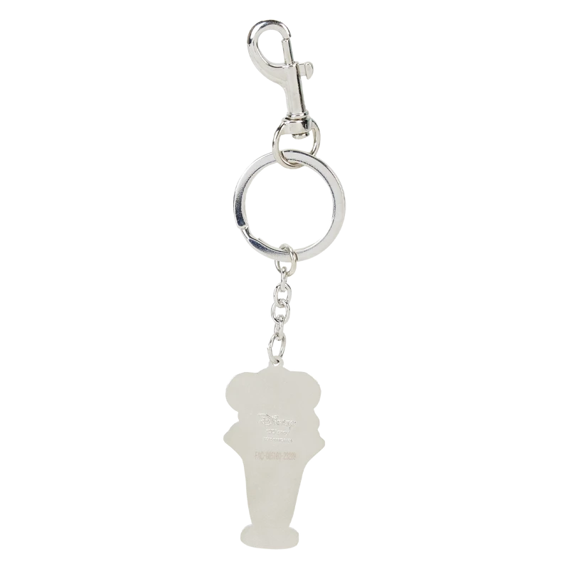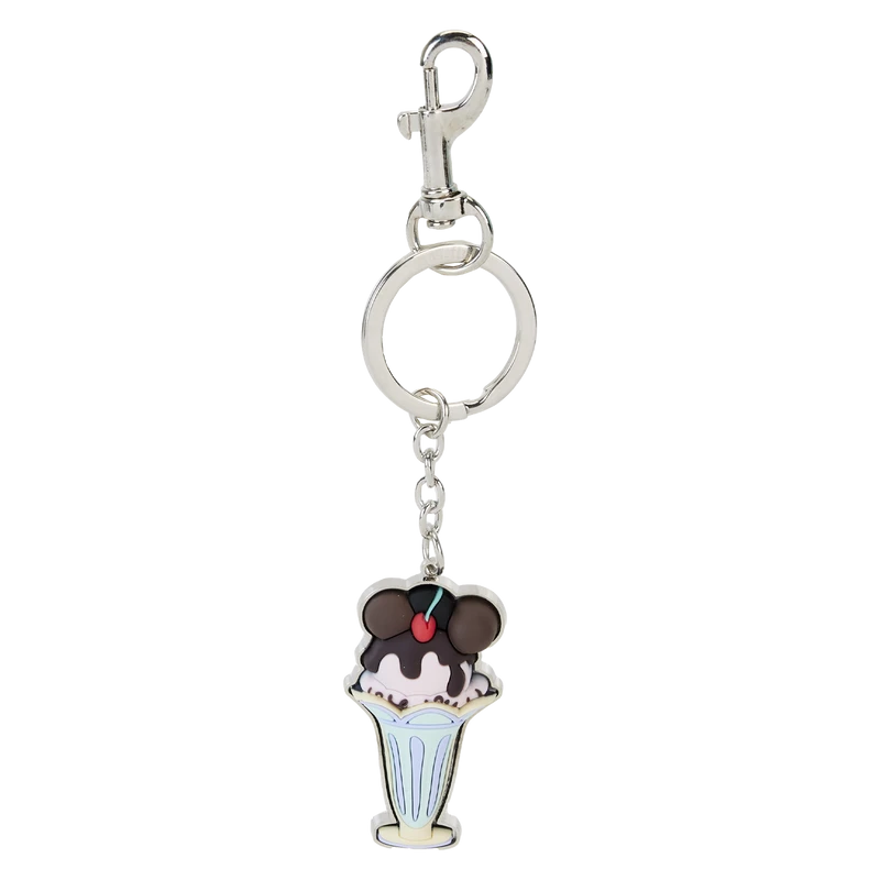 Duck into the diner for a stylish treat! The Mickey Mouse and Minnie Mouse Date Night Ice Cream Silicone Keychain is ready for fun! This keychain takes on the shape of an ice cream treat in an old-fashioned soda glass. The scoops of ice cream form Mickey Mouse ears as well! The silicone on the front contrasts with the metal backing to create a unique texture. Treat yourself with this charming accessory.