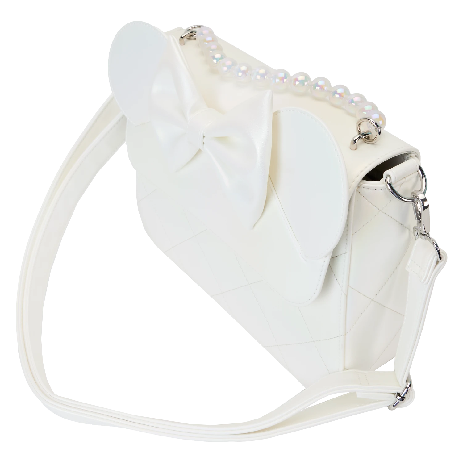 The Loungefly Iridescent Wedding Crossbody Bag features vegan leather (polyurethane), silver-colored metal hardware, a molded pearl handle, a 3D bow with tulle, adjustable and detachable shoulder strap, and applique, quilted, molded pearl, and printed details. Take note of the coordinating inside lining.