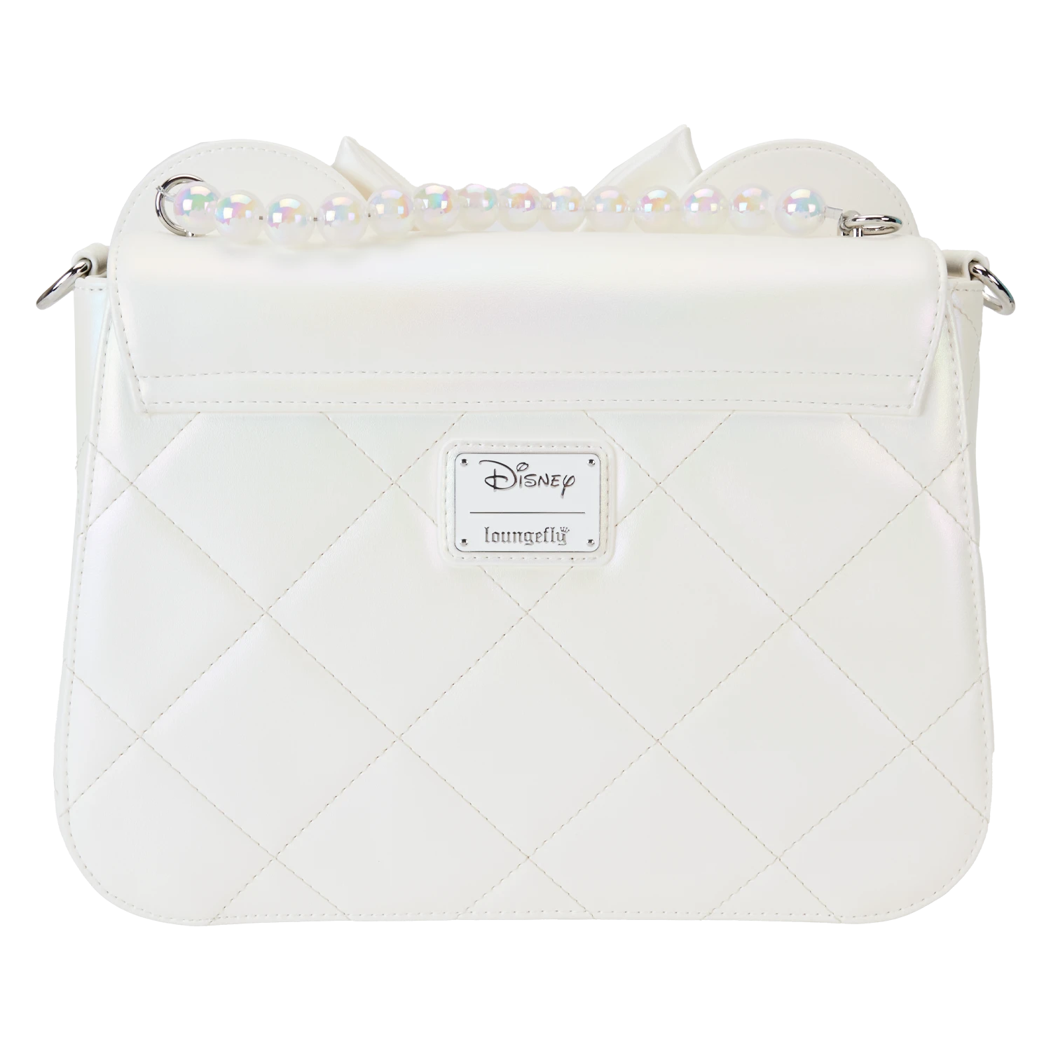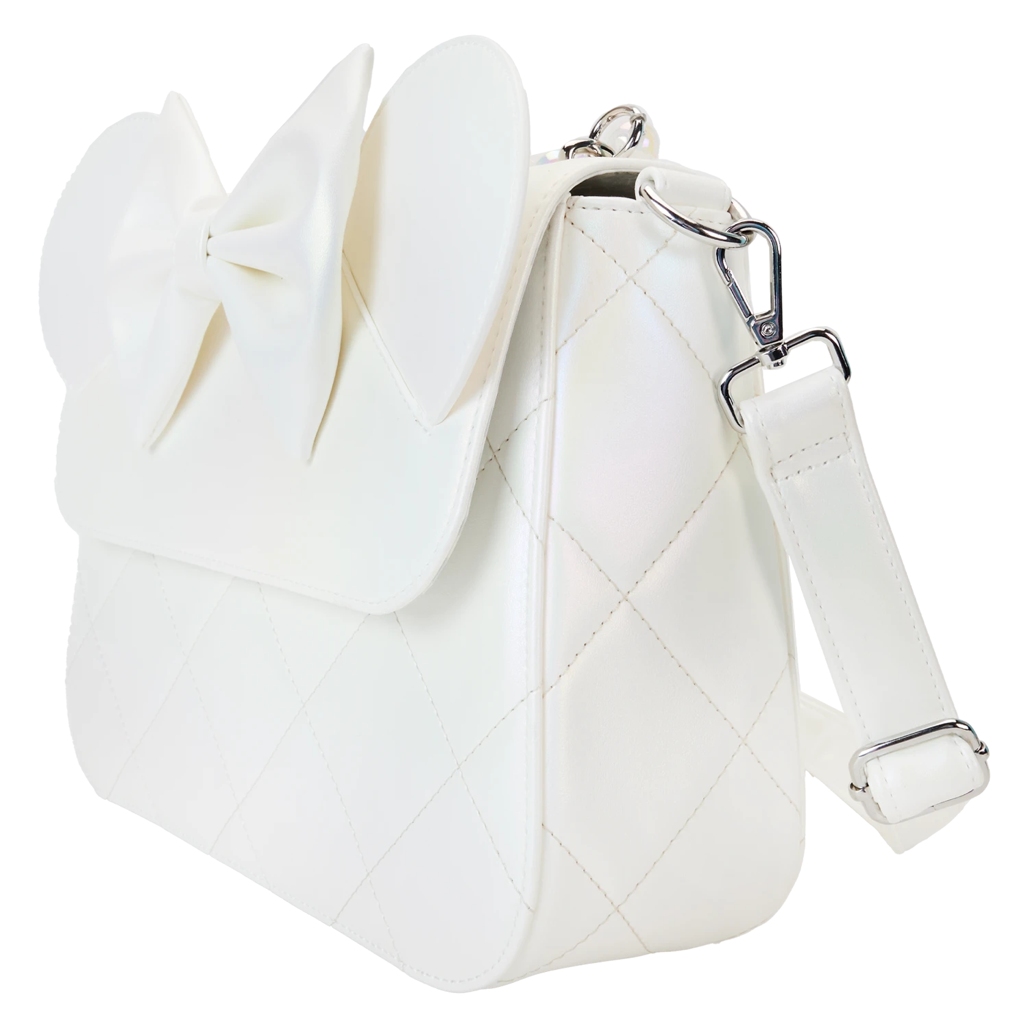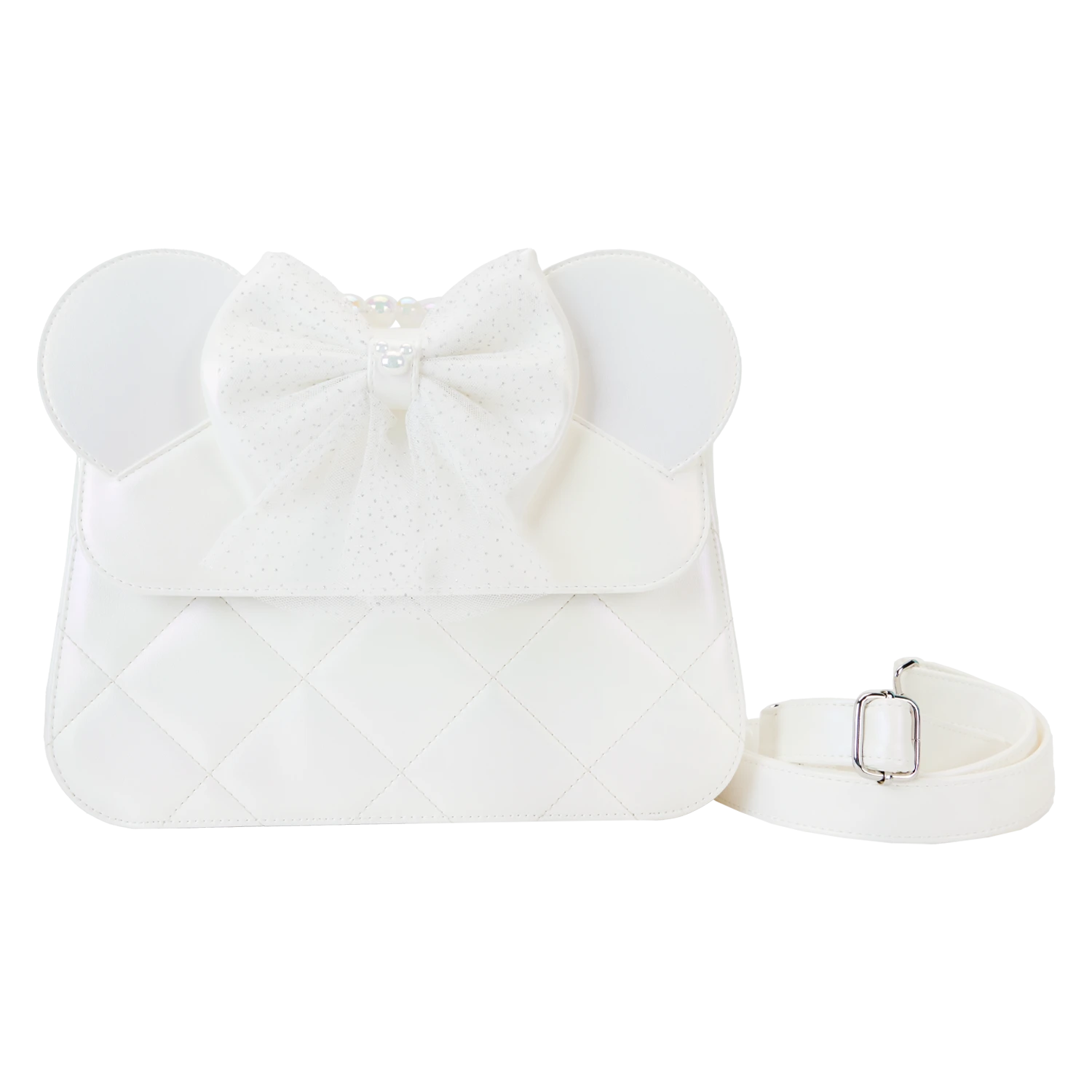 Yoohoo! Say, “I do!” Our Loungefly Iridescent Wedding Crossbody Bag is ready for a special day. This pearly white accessory, with iridescent details, makes an elegant and fun addition to a festive occasion. A quilted pattern covers the front, sides, and back. Over the top flap, you’ll find a 3D applique bow with tulle. The tulle, which is removable, includes sparkles of silver “confetti.” In the center of the bow, you’ll find a Mickey Mouse ears molded pearl decoration. Above, characteristic applique ears in white poke up over the top. A molded pearl handle adds a lovely touch. Pack just what you need for the day to celebrate in style.