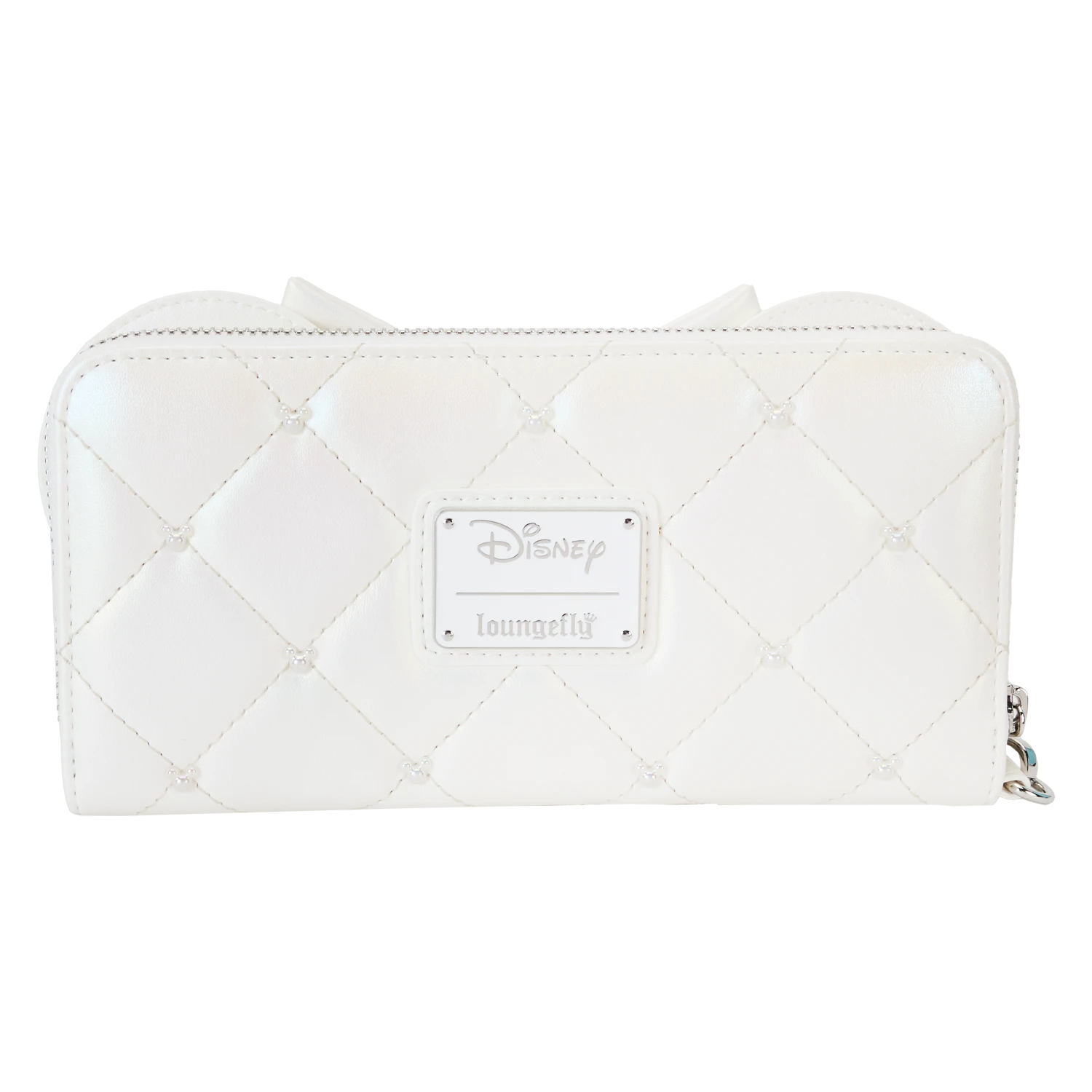 The Loungefly Iridescent Wedding Wristlet Wallet is made of vegan leather (polyurethane). Wallet zips closed with shiny silver-colored metal hardware, and the wristlet strap is detachable. Additional features include applique, quilted, 3D bow, molded pearl, and printed details. Take note of the coordinating inside lining.