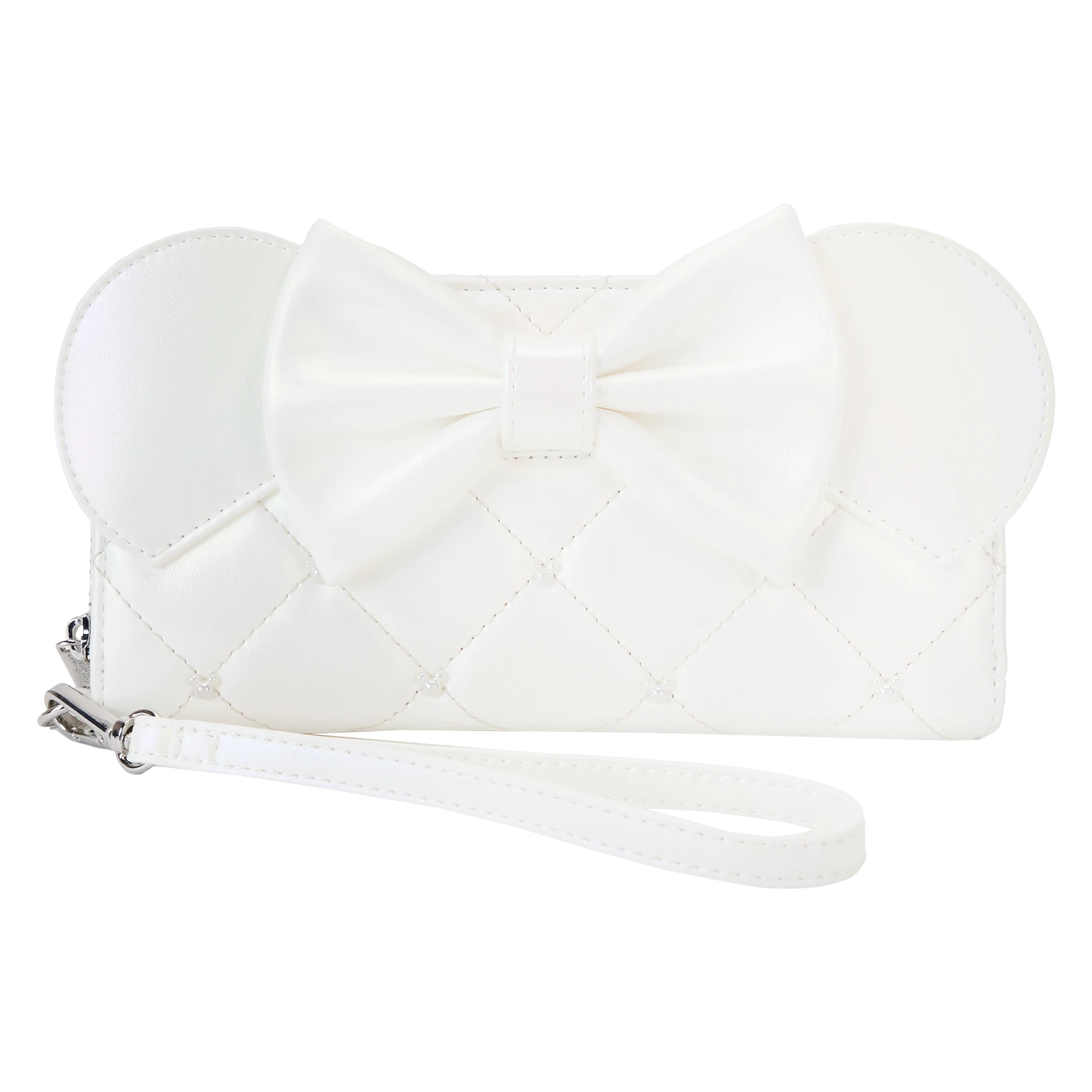 Yoohoo! Say, “I do!” Our Loungefly Iridescent Wedding Wristlet Wallet is ready for a special day. This pearly white accessory, with iridescent details, makes an elegant and fun addition to a festive occasion. A quilted pattern covers the front and back, with molded pearl decorations in the shape of Mickey Mouse ears at various diamond points. An applique 3D bow sits at the top, and signature mouse ears poke up over the accessory. Inside this roomy accessory, you’ll find approximately eight slots for holding cards and one clear slot for displaying your ID. A die-cut shape of a heart, on the clear ID slot, adds a lovely touch. Secure your valuables for the day to celebrate in style.