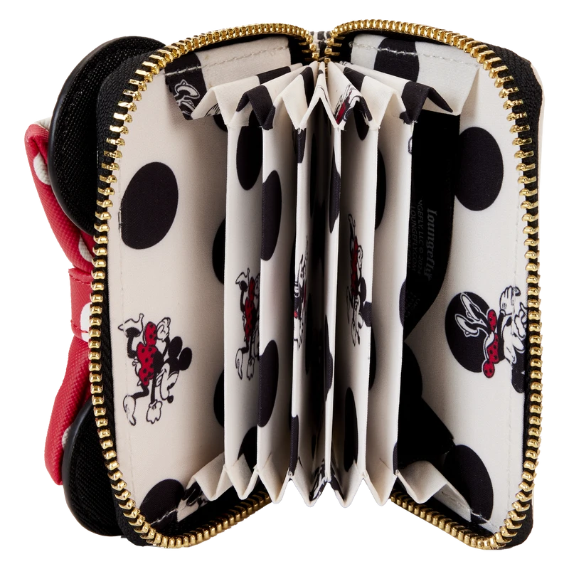 The Minnie Mouse Rocks the Dots Accordion Card Holder is made of Saffiano vegan leather. Other features include gold-colored metal hardware, a 3D applique bow, and embossed and printed details. Take note of the coordinating inside lining.