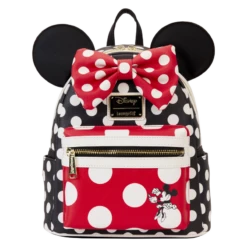 Our dotted line has a signature touch! This Minnie Mouse Rocks the Dots Classic Mini Backpack is a fresh and fabulous take on a classic style. A white dot pattern, against a black background, appears on the front, sides, and back of this accessory. The front pocket, and characteristic 3D bow at the top, offer pops of red color with white polka dots. On either side of the bow, Minnie Mouse’s ears rise up in applique detail. The front pocket also features a printed vintage image of Minnie Mouse herself. She’s seated upon a dot, freshening up her look in a compact mirror. There’s plenty of room to pack just what you need for a day’s journey, or for arriving on the dot to a fun event, in style.