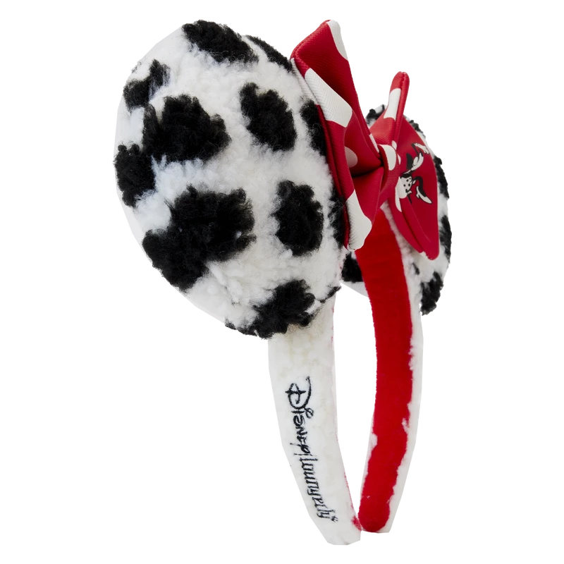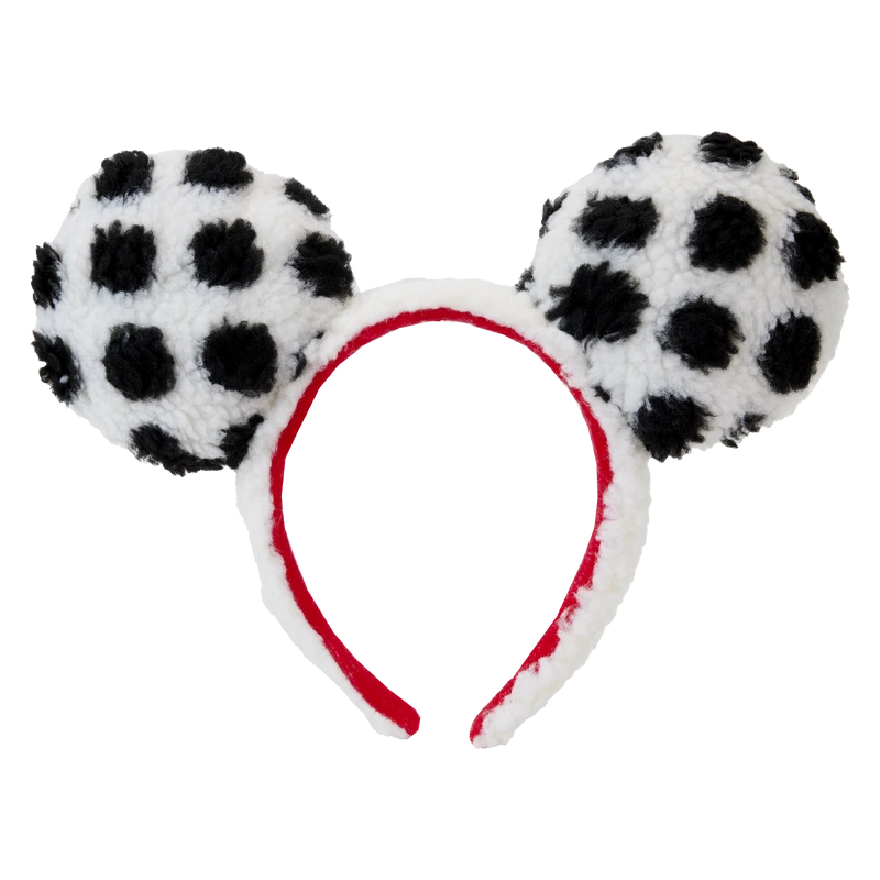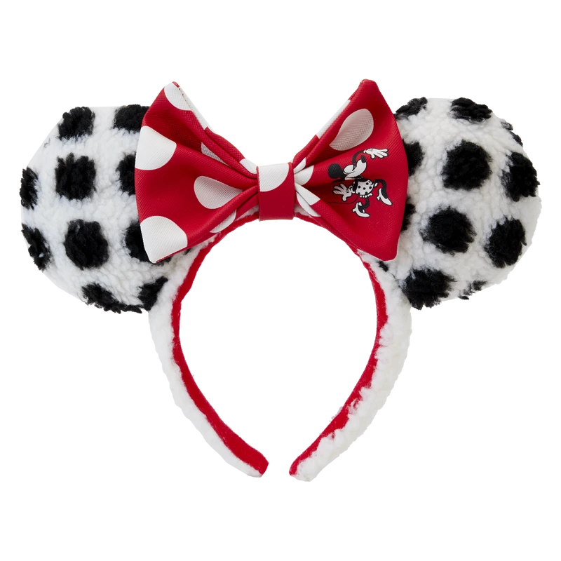 Our dotted line has a signature touch! This Minnie Mouse Rocks the Dots Sherpa Headband is a fresh and fabulous take on a classic style. Soft sherpa fabric, in white with black dots, covers the applique ears on both sides. A red applique 3D bow, with white polka dots appears between the ears. Minnie Mouse makes a starring appearance as an embossed, printed vintage image, dancing across the bow, which is removable. The sherpa fabric extends to the band, and on the side, you’ll find the embroidered Loungefly logo. Arrive on the dot and in style with this fun accessory.