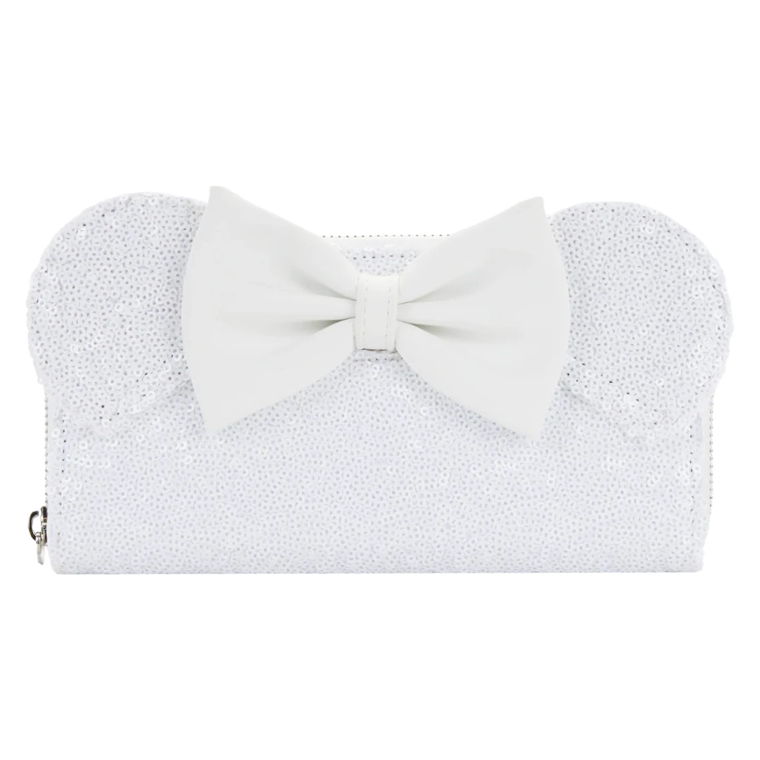 Everyone deserves a โhappily ever afterโ! Celebrate your own magical love story with the Loungefly Minnie Sequin Wedding Zip Around Wallet. This swoon-worthy wallet is covered in white sequins to add a bit of sparkle to your real-life fairytale. With 7 slots for holding cards, a clear slot to hold your ID, and a zippered pocket, this accessory is perfect for adding a dash of romance to every day.