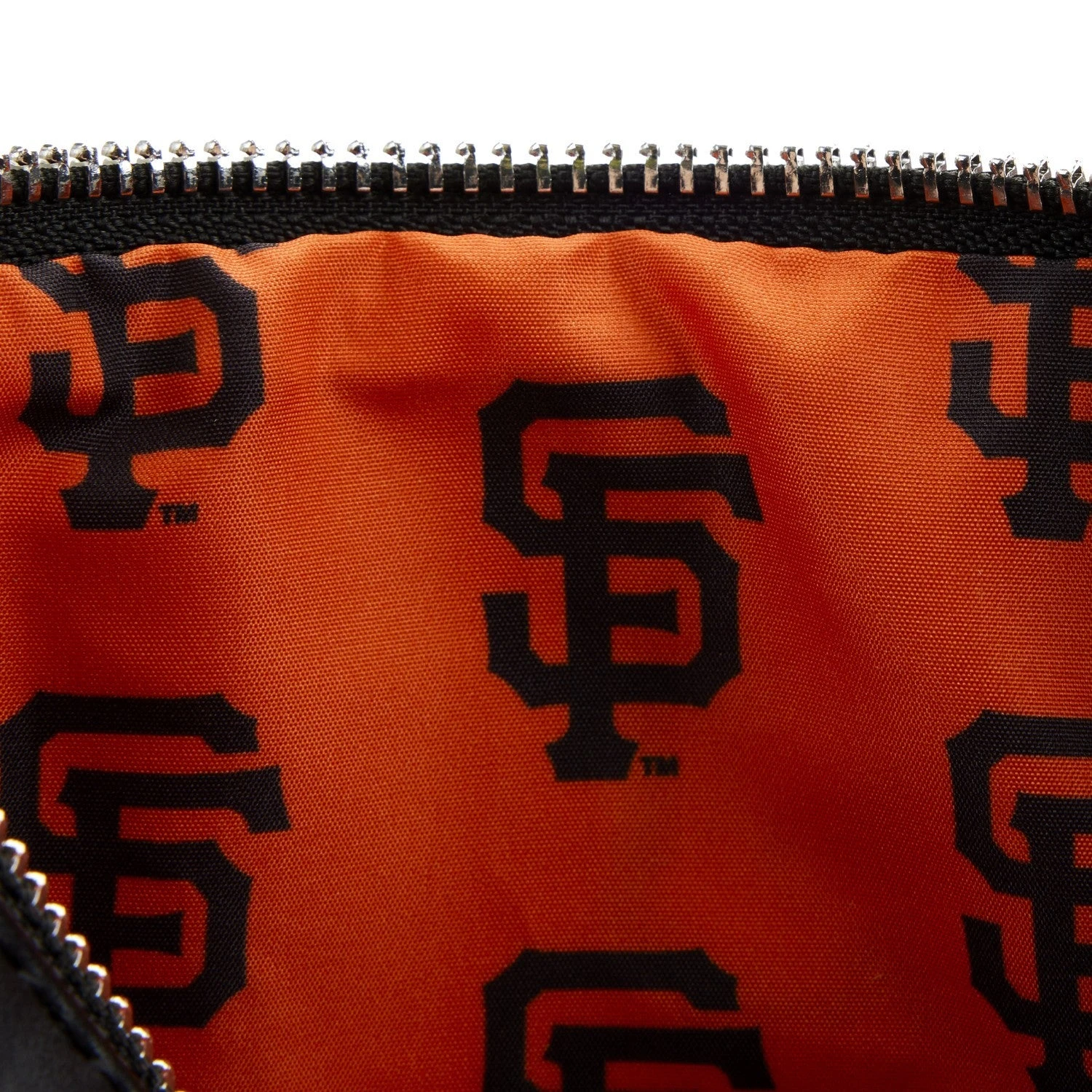 The MLB SF Giants Stadium Crossbody Bag is made of clear PVC with vegan leather trim, and the removable inside pouch is made of vegan leather (polyurethane). Bag has adjustable, detachable shoulder strap and sturdy metal hardware. Additional features include printed, embroidered, and patch details. Take note of the coordinating inside lining of the removeable pouch.